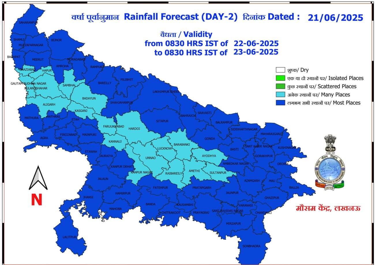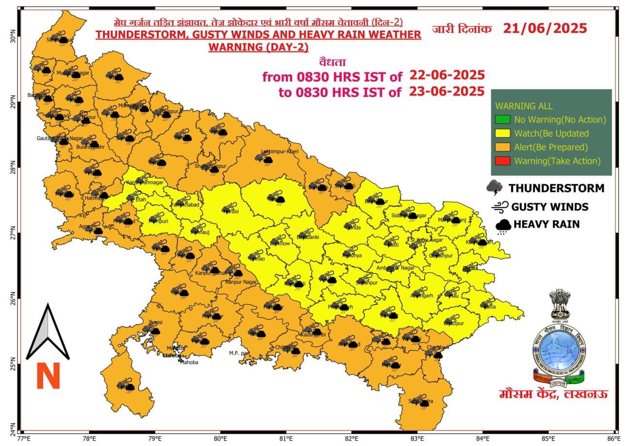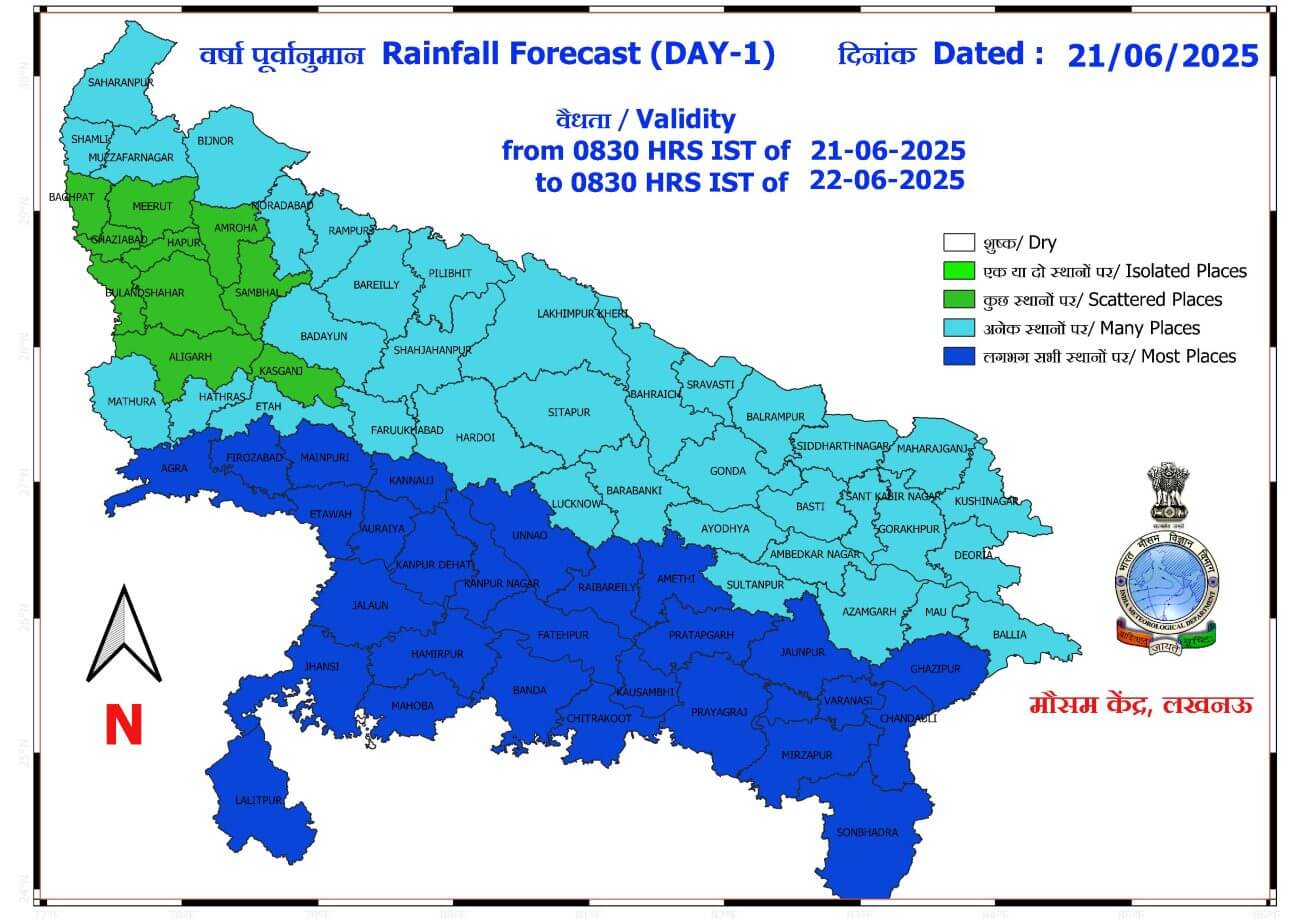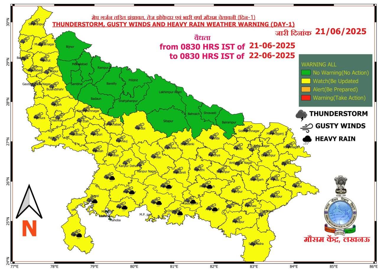 मानसून के सक्रिय होते ही 27 जून तक उत्तर प्रदेश में मध्यम से भारी बारिश का दौर जारी रहने वाला है। आज 21 जून को पश्चिमी यूपी में अनेक स्थान और पूर्वी यूपी में लगभग सभी स्थानों पर गरज चमक के साथ बारिश की चेतावनी जारी की गई। पश्चिमी यूपी में कहीं कहीं भारी बारिश और पूर्वी यूपी में भारी से अति भारी बारिश होने की संभावना जताई गई है।