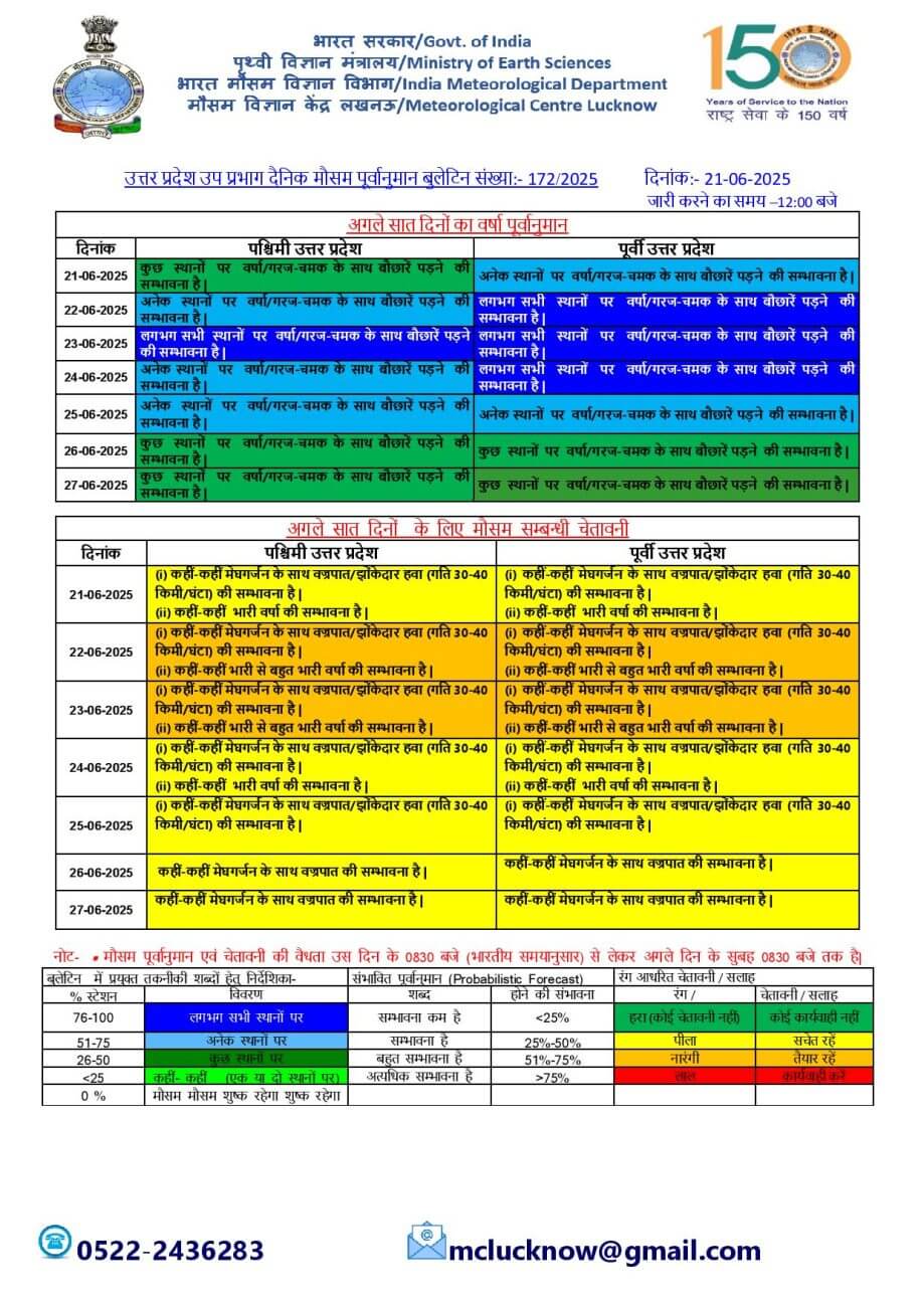 - 21 जून को कहीं-कहीं मेघगर्जन के साथ वज्रपात/झोंकेदार हवा (गति 30-40 किमी/घंटा) ।कहीं-कहीं भारी वर्षा ।