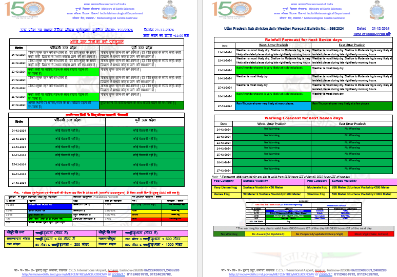 - 24 और 25 दिसंबर को पश्चिमी यूपी और पूर्वी यूपी में मौसम साफ रहेगा। पूर्वी यूपी में देर रात और सुबह के समय छिछला से मध्यम कोहरा छाने के आसार हैं।