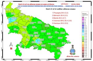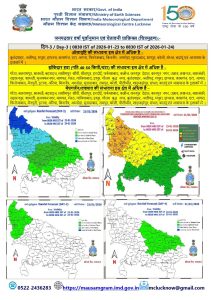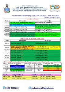 - 23 जनवरी को पूर्वी व पश्चिमी उत्तर प्रदेश में कहीं-कहीं मेघगर्जन, वज्रपात और ओलावृष्टि की संभावना जताई गई है। इस दौरान झोंकेदार हवा की गति 30 से 50 किमी/घंटा रह सकती है। इस दौरान अधिकतम और न्यूनतम तापमान में उतार-चढ़ाव देखने को मिलेगा।