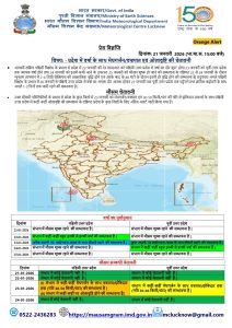 - गोंडा, बलरामपुर, श्रावस्ती, बहराइच, लखीमपुर खीरी, सीतापुर, हरदोई, फर्रुखाबाद, कन्नौज, कानपुर देहात, कानपुर नगर, उन्नाव, लखनऊ, बाराबंकी, सहारनपुर, शामली, मुजफ्फरनगर, बागपत, मेरठ, गाजियाबाद, हापुर, गौतम बुद्ध नगर, बुलंदशहर, अलीगढ़, मथुरा, हाथरस, कासगंज, एटा, आगरा, फिरोजाबाद, मैनपुरी, इटावा, औरैया, बिजनौर, अमरोहा, मुरादाबाद, रामपुर, बरेली, पीलीभीत, शाहजहांपुर, संभल, बदायूं जिलों में बारिश, मेघगर्जन व वज्रपात की संभावना है।