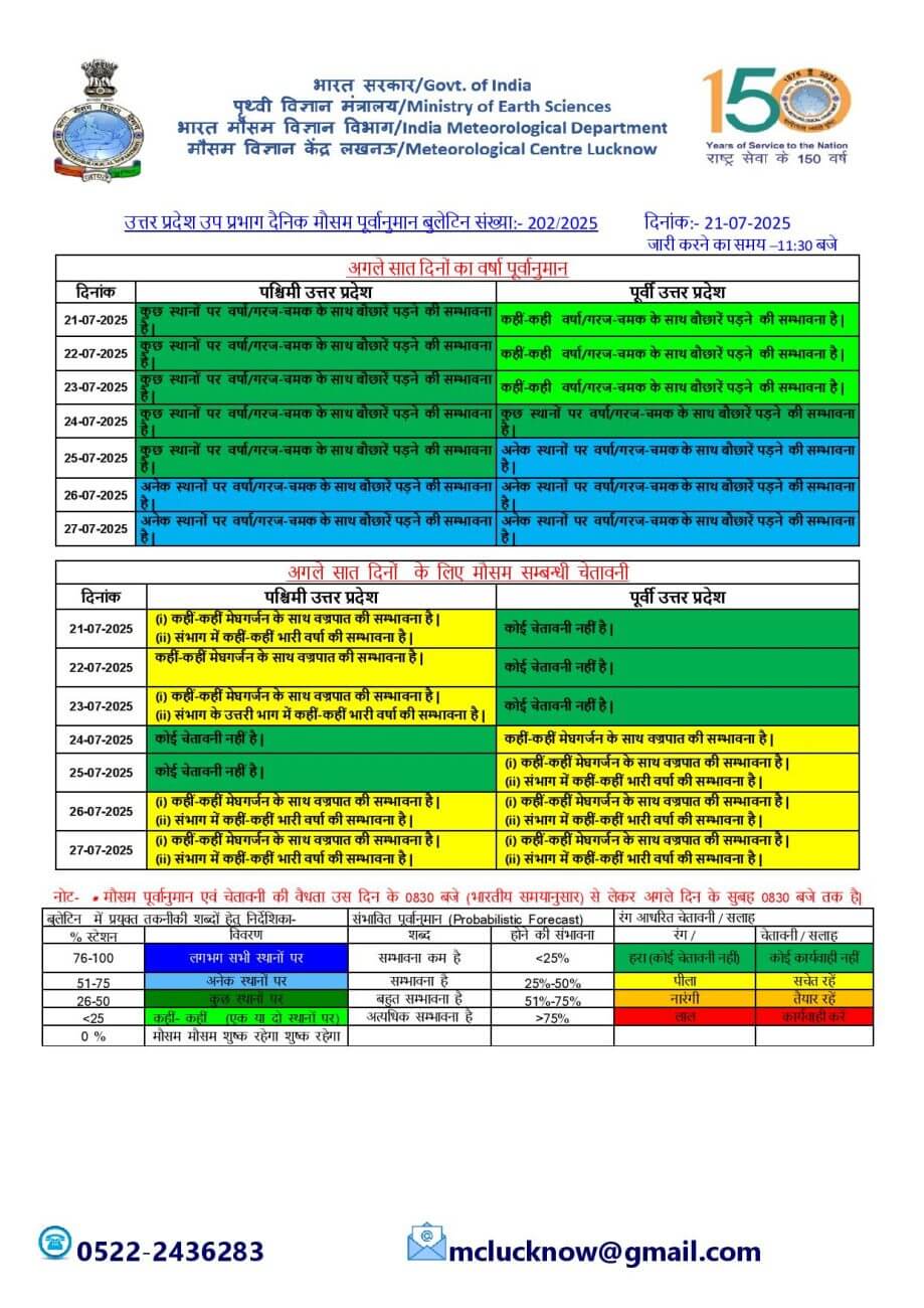 - 25-07-2025: पश्चिमी में कुछ/ पूर्वी यूपी में अनेक स्थानों पर वर्षा/गरज-चमक के साथ बौछारें ।मेघगर्जन और वज्रपात के भी आसार।