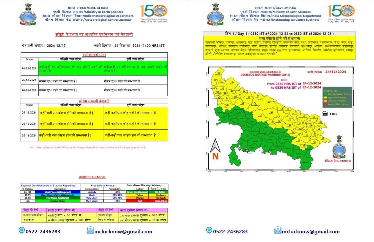 - 25 दिसंबर को पश्चिमी यूपी और पूर्वी यूपी में मौसम साफ रहेगा। पूर्वी यूपी में देर रात और सुबह के समय छिछला से मध्यम कोहरा छाने के आसार हैं।