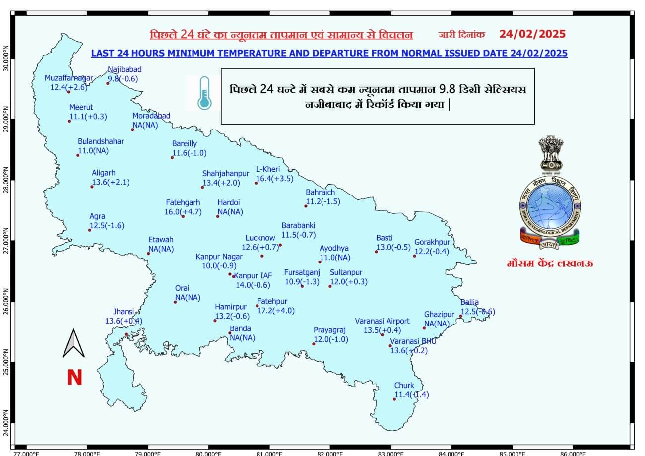 UP Weather Update : आज सोमवार को प्रदेश के पश्चिमी और पूर्वी हिस्से मौसम साफ और शुष्क रहने वाला है। हालांकि इस दौरान दोनों हिस्सों में हल्के से छिछला कोहरा देखने को मिलेगा। इस दौरान तापमान में भी उतार चढ़ाव जारी रहेगा।