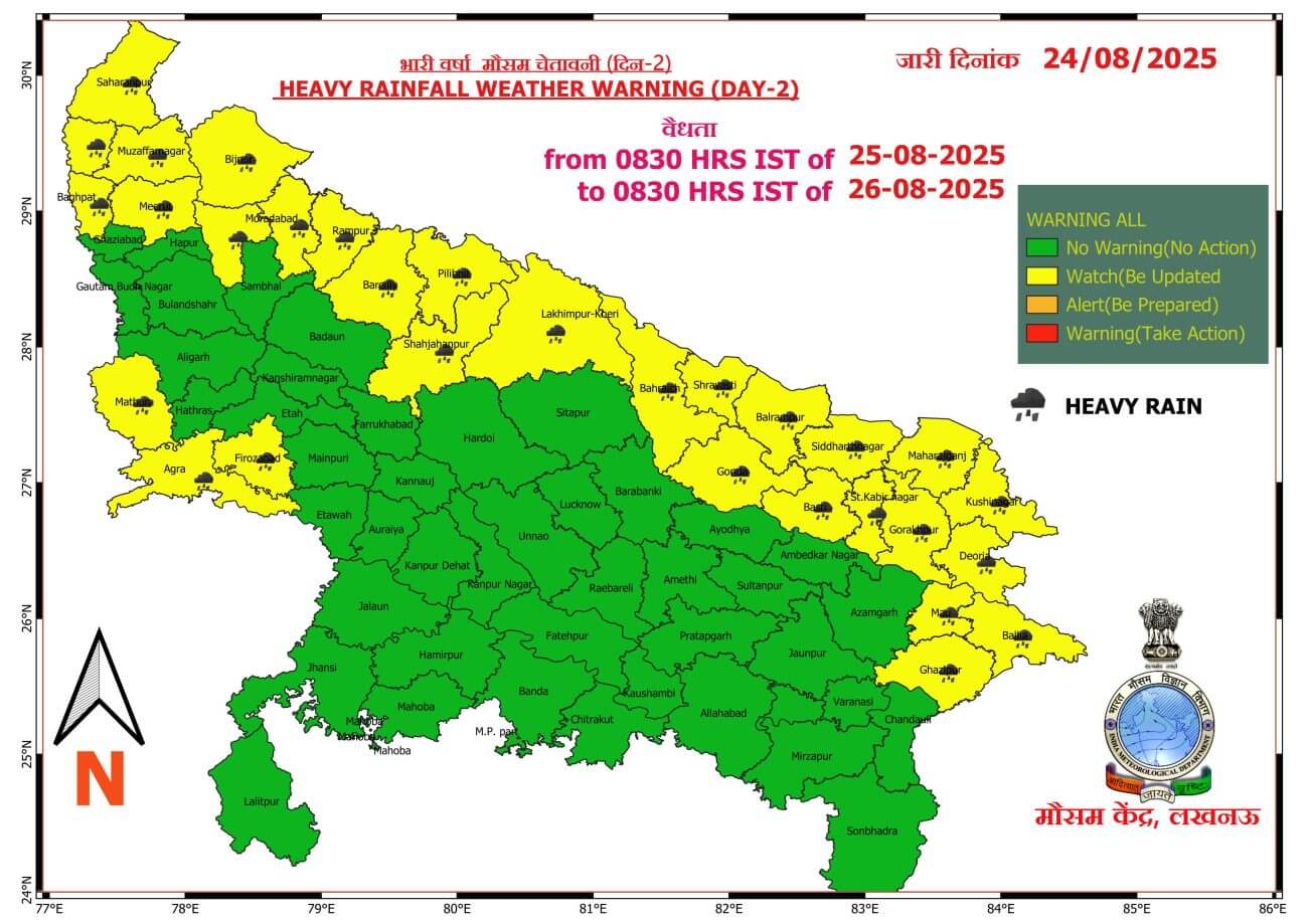- 26-08-2025: पश्चिमी / पूर्वी यूपी में अनेक स्थानों पर वर्षा/गरज-चमक के साथ बौछारें ।