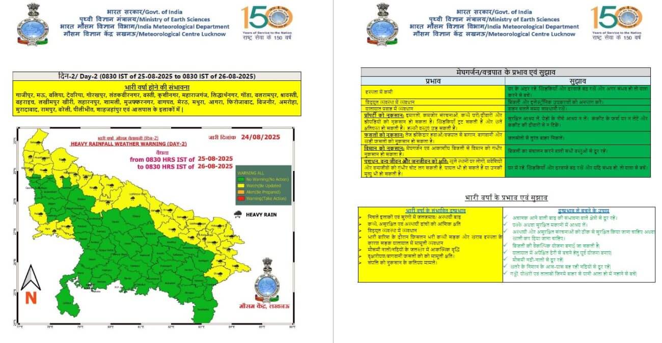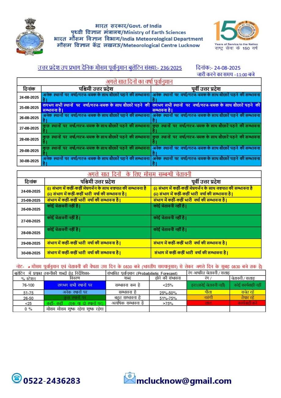 - 25-08-2025: पश्चिमी / पूर्वी यूपी में लगभग सभी स्थानों पर वर्षा/गरज-चमक के साथ बौछारें । कहीं कहीं भारी बारिश, मेघगर्जन, वज्रपात