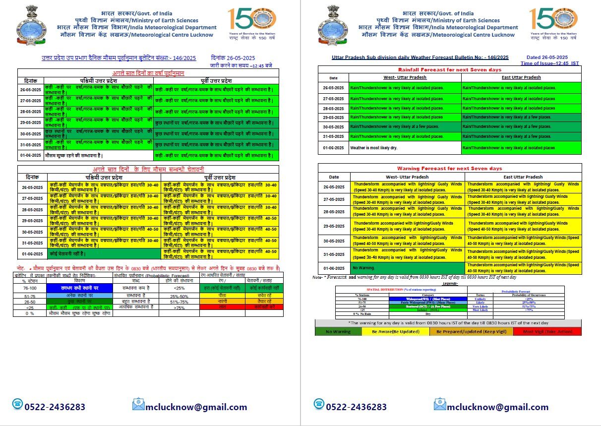 27 -28 मई को पश्चिमी यूपी में कहीं-कहीं पर और पूर्वी यूपी में कुछ स्थानों पर बारिश और गरज चमक के साथ बौछारें पड़ सकती है। 29 मई को दोनों हिस्सों में कुछ स्थानों पर बारिश होने की संभावना है। 30 और 31 मई को पश्चिमी यूपी में कुछ स्थानों पर और पूर्वी यूपी में अनेक स्थानों पर बारिश हो सकती है।1 जून पश्चिमी यूपी में मौसम साफ रहेगा लेकिन पूर्वी यूपी में बादल छाने के साथ बारिश की संभावना है।