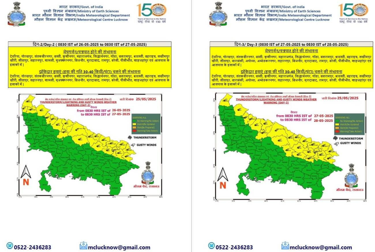इस दौरान दोनों हिस्सों में कहीं-कहीं पर बादल गरजने व बिजली चमकने के साथ ही 30 से 40 किलोमीटर प्रति घंटा की रफ्तार से झोंकेदार हवा चल सकती है। अगले 5 दिनों के दौरान अधिकतम और न्यूनतम तापमान में कोई बड़ा परिवर्तन होने की संभावना नहीं है। लखनऊ में सोमवार और मंगलवार को कोई चेतावनी नहीं है।