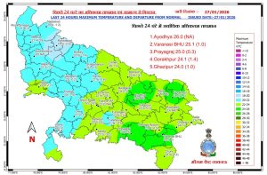 - पश्चिमी विक्षोभ के असर से 27 जनवरी को पश्चिमी उत्तर प्रदेश में सभी स्थानों पर और पूर्वी उत्तर प्रदेश में कुछ स्थानों पर मेघगर्जन, वज्रपात और बारिश की संभावना जताई गई है।