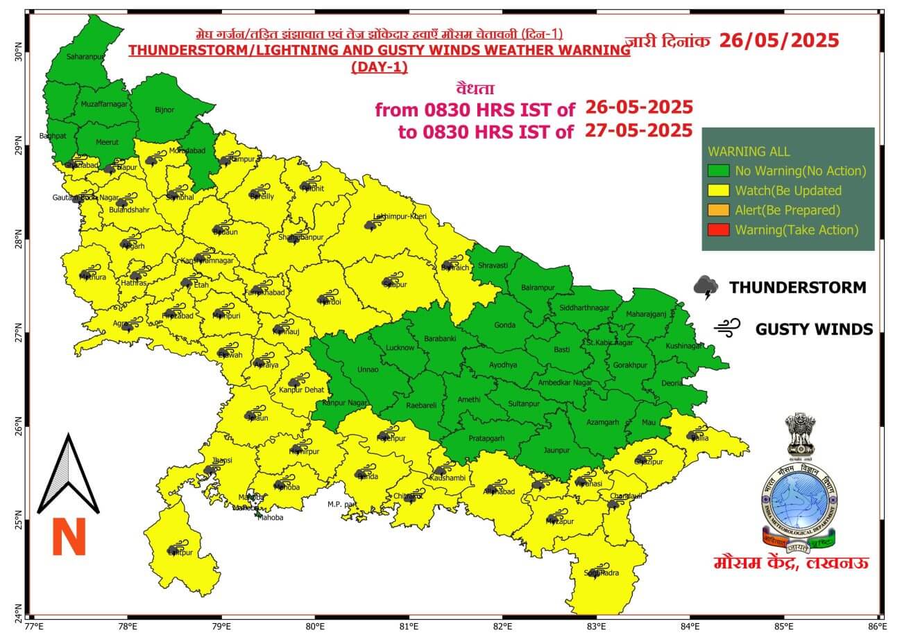 UP Weather Alert: अलग अलग स्थानों पर सक्रिय मौसम प्रणालियों के चलते प्रदेश में 1 जून तक मौसम का मिजाज यूही बना रहेगा। आज मंगलवार को प्रदेश के पश्चिमी और पूर्वी हिस्से में बादल गरजने, बारिश और आंधी चलने का अनुमान है।इस अवधि में दोनों हिस्सों में कहीं-कहीं पर बादल गरजने व बिजली चमकने के साथ ही 30 से 40 किमी प्रति घंटा की रफ्तार से झोंकेदार हवा चल सकती है।