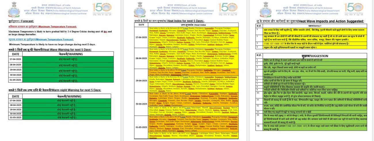अगले 48 घंटों के दौरान अधिकतम तापमान में 2-4 डिग्री सेल्सियस गिरावट और अगले 5 दिनों के दौरान न्यूनतम तापमान में कोई बड़ा परिवर्तन होने की संभावना नहीं है। पश्चिमी यूपी में 30 अप्रैल से 4 मई तक गरज-चमक के साथ बारिश होने की संभावना है। साथ ही तेज झोंकेदार हवाएं भी 40 से 50 किमी प्रति घंटे की गति से चल सकती हैं।
