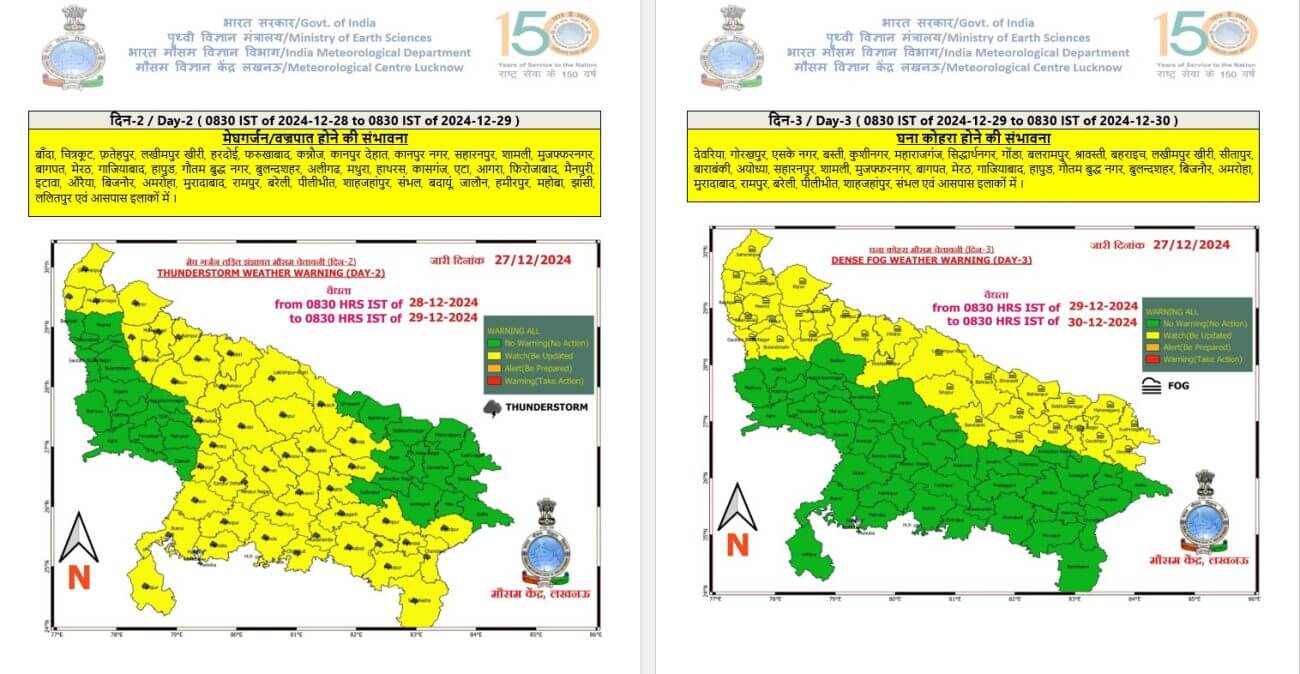 यूपी मौसम विभाग की मानें तो 28 और 29 दिसंबर को पश्चिमी यूपी में बारिश के अलावा कहीं-कहीं मेघर्गजन और वज्रपात होने की संभावना है।30 दिसंबर से मौसम में बदलाव आएगा। और न्यूनतम तापमान में गिरावट आएगी। इस दौरान घने कोहरे, ठंड़ और शीतलहर का असर देखने को मिलेगा।31 दिसंबर और एक जनवरी को बारिश का अनुमान नहीं है।