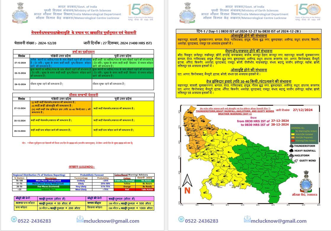 - 28 दिसंबर: बांदा, चित्रकूट, फतेहपुर, लखीमपुर खीरी, हरदोई, फर्रुखाबाद, कन्नौज, कानपुर देहात, कानपुर नगर, सहारनपुर, शामली, मुजफ्फरनगर, बागपत में गरज-चमक के साथ बारिश ।