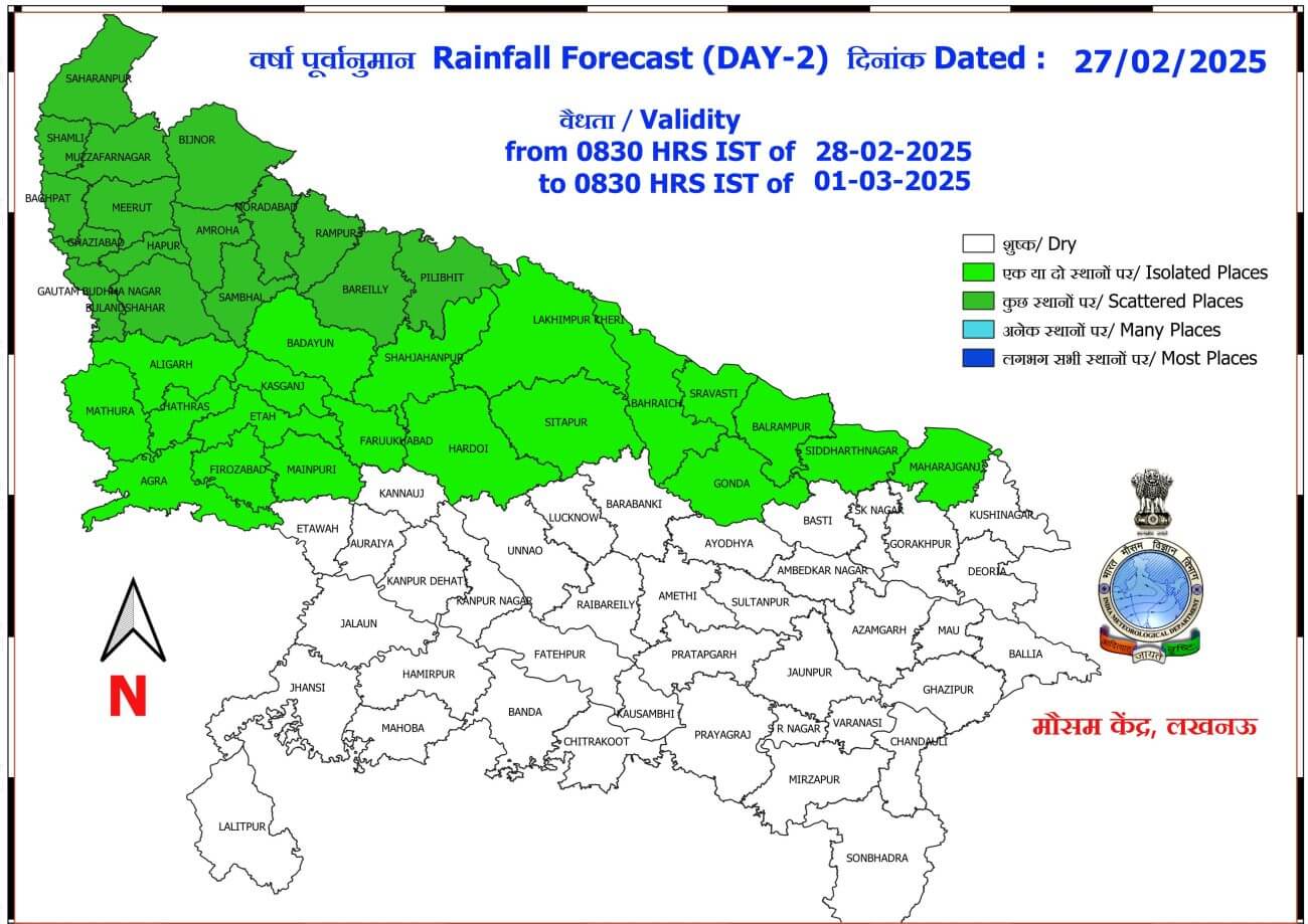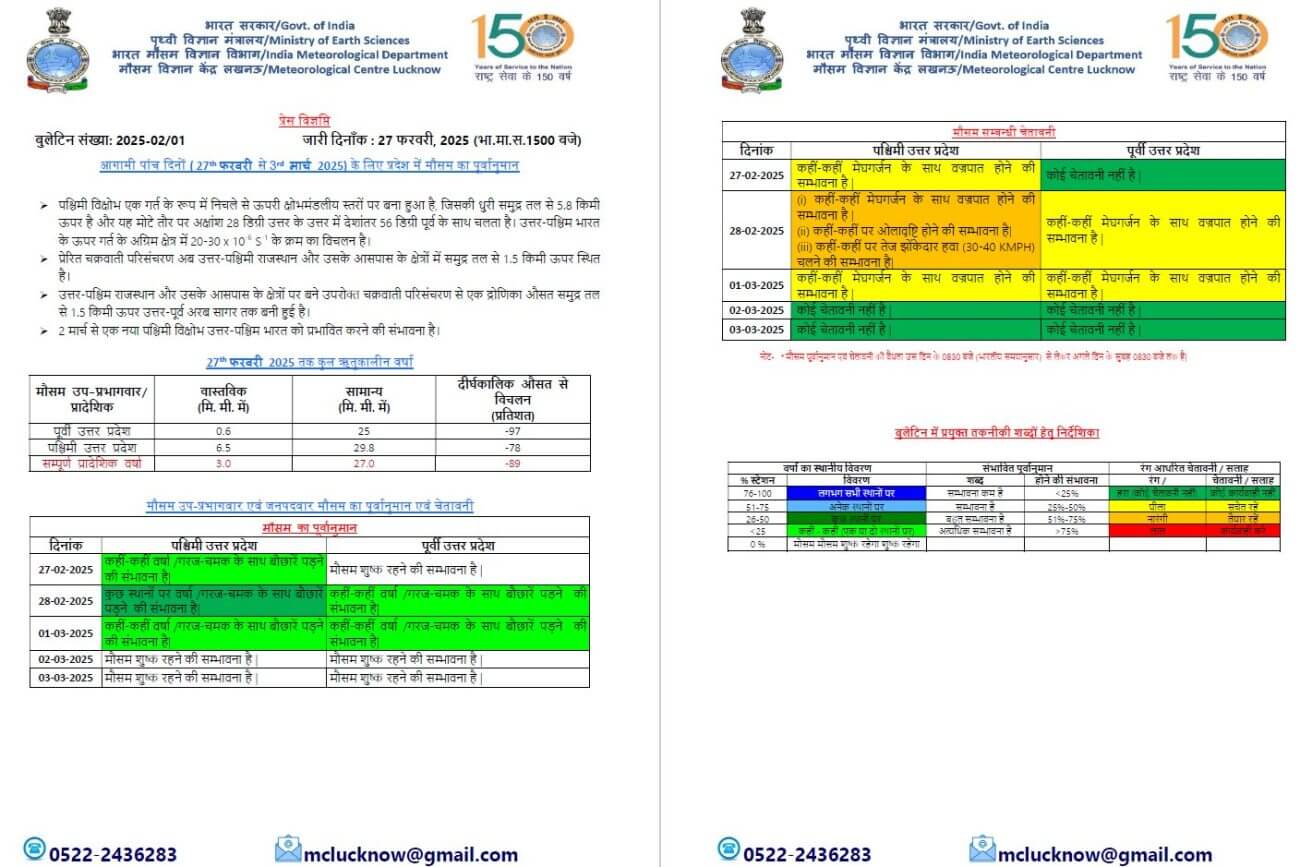 यूपी मौसम विभाग के मुताबिक, 28 फरवरी और 1 मार्च को पश्चिमी व पूर्वी यूपी में गरज चमक के साथ बारिश चेतावनी जारी की गई है। इस दौरान 30 से 40 किलोमीटर प्रति घंटा की रफ्तार से तेज हवा चलने का अलर्ट जारी किया गया है। प्रदेश में सुबह और रात के समय कहीं-कहीं छिछला कोहरा छाने की भी संभावना है।