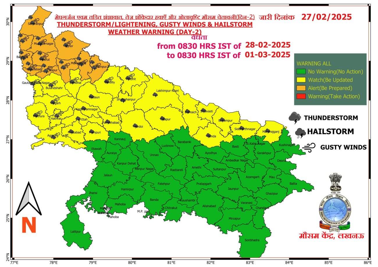 - सहारनपुर, शामली, मुजफ्फरनगर, बागपत, मेरठ, गाजियाबाद, हापुड, बिजनौर, अमरोहा, रामपुर, मुरादाबाद और उसके आसपास के इलाकों में ओलावृष्टि का अलर्ट।