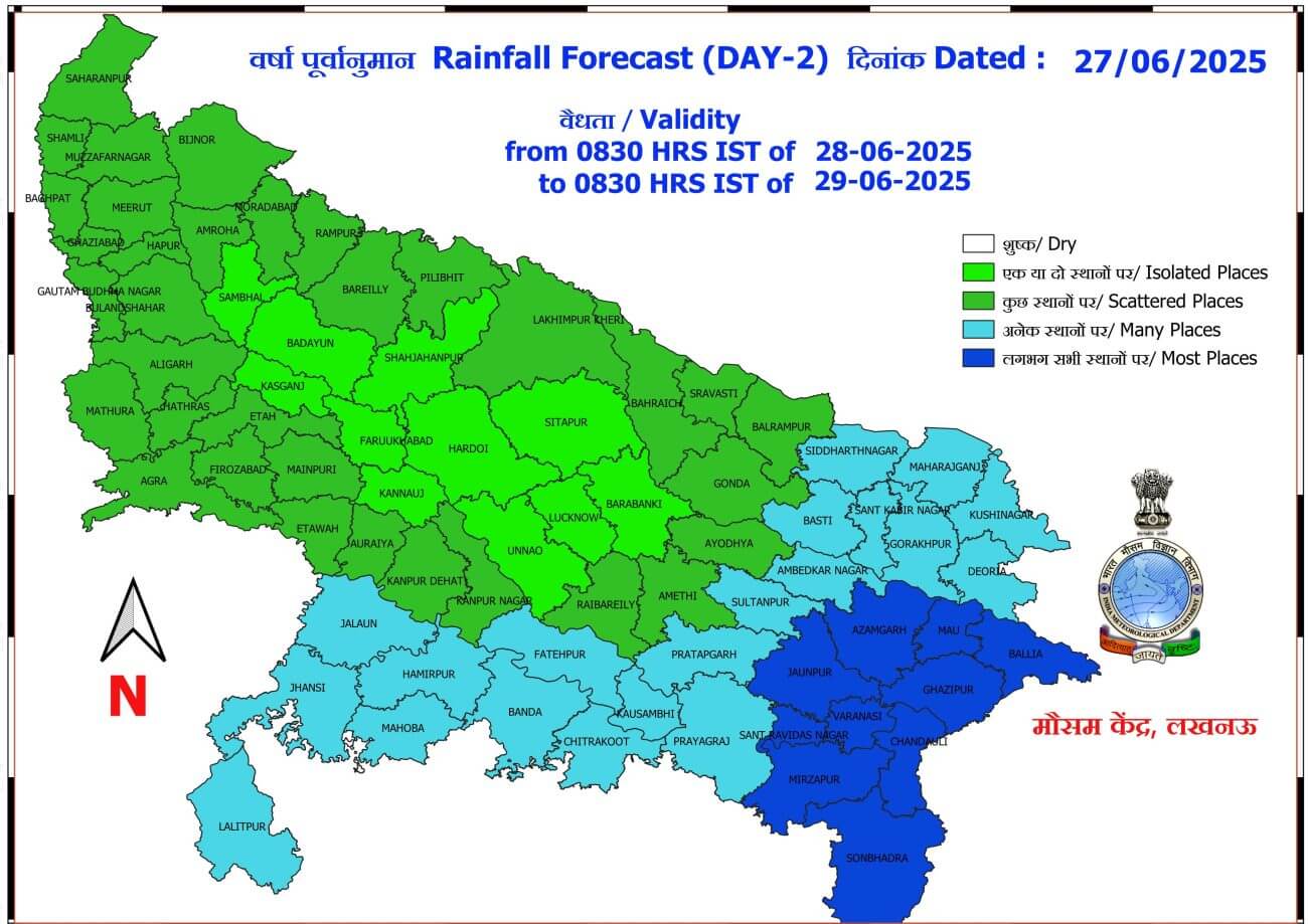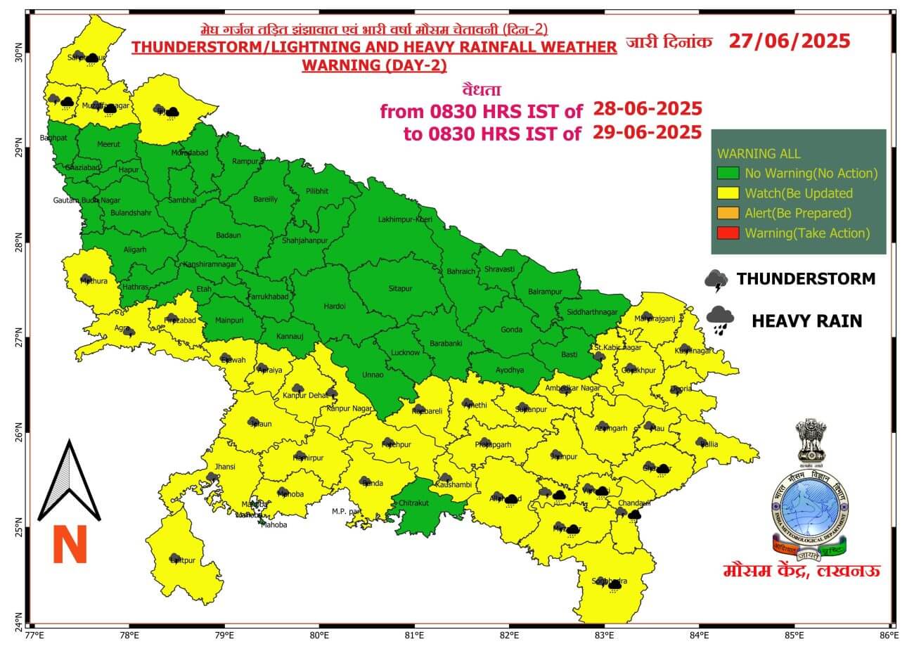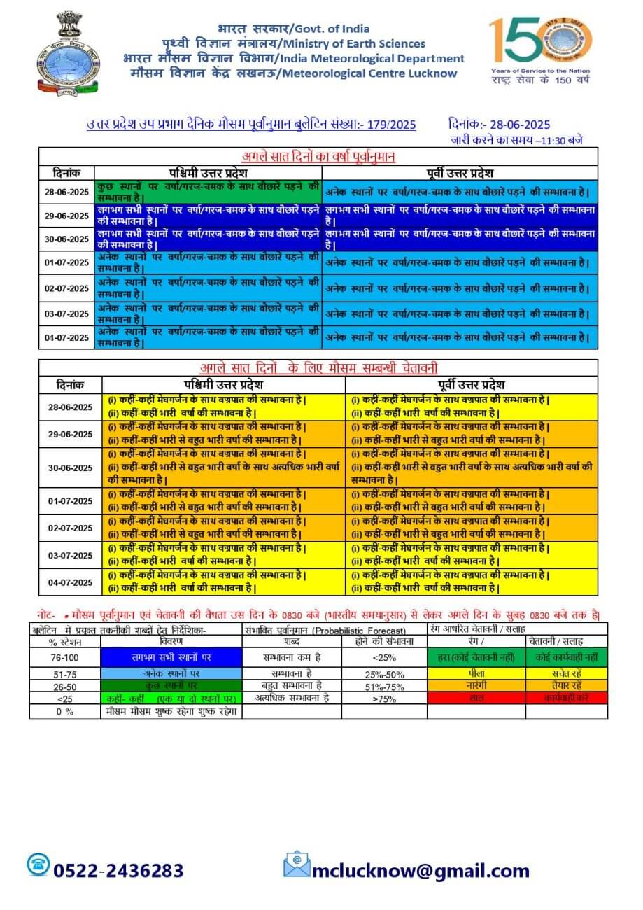 - 29-06-2025 पश्चिमी व पूर्वी यूपी में लगभग सभी स्थानों पर वर्षा/गरज-चमक के साथ बौछार।कहीं-कहीं मेघगर्जन के साथ वज्रपात / अति भारी वर्षा की सम्भावना है।
