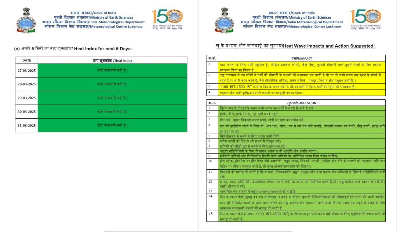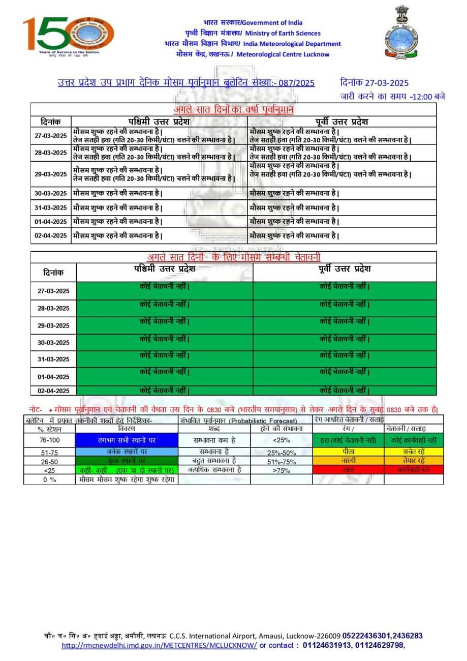- 1-2 अप्रैल को प्रदेश के पश्चिमी व पूर्वी हिस्से में मौसम साफ रह सकता है।कोई अलर्ट जारी नहीं किया गया है।इस दौरान लखनऊ, कानपुर, झांसी, आगरा, काशी, प्रयागराज, चंदौली, बांदा,हमीरपुर, महोबा, जालौन,सोनभद्र, मिर्जापुर, प्रतापगढ़, कौशाम्बी, रायबरेली, ललितपुर, इटावा, मैनपुरी, मथुरा और अलीगढ़ में अधिकतम तापमान 40 डिग्री सेल्सियस तक पहुंचने का अनुमान है।
