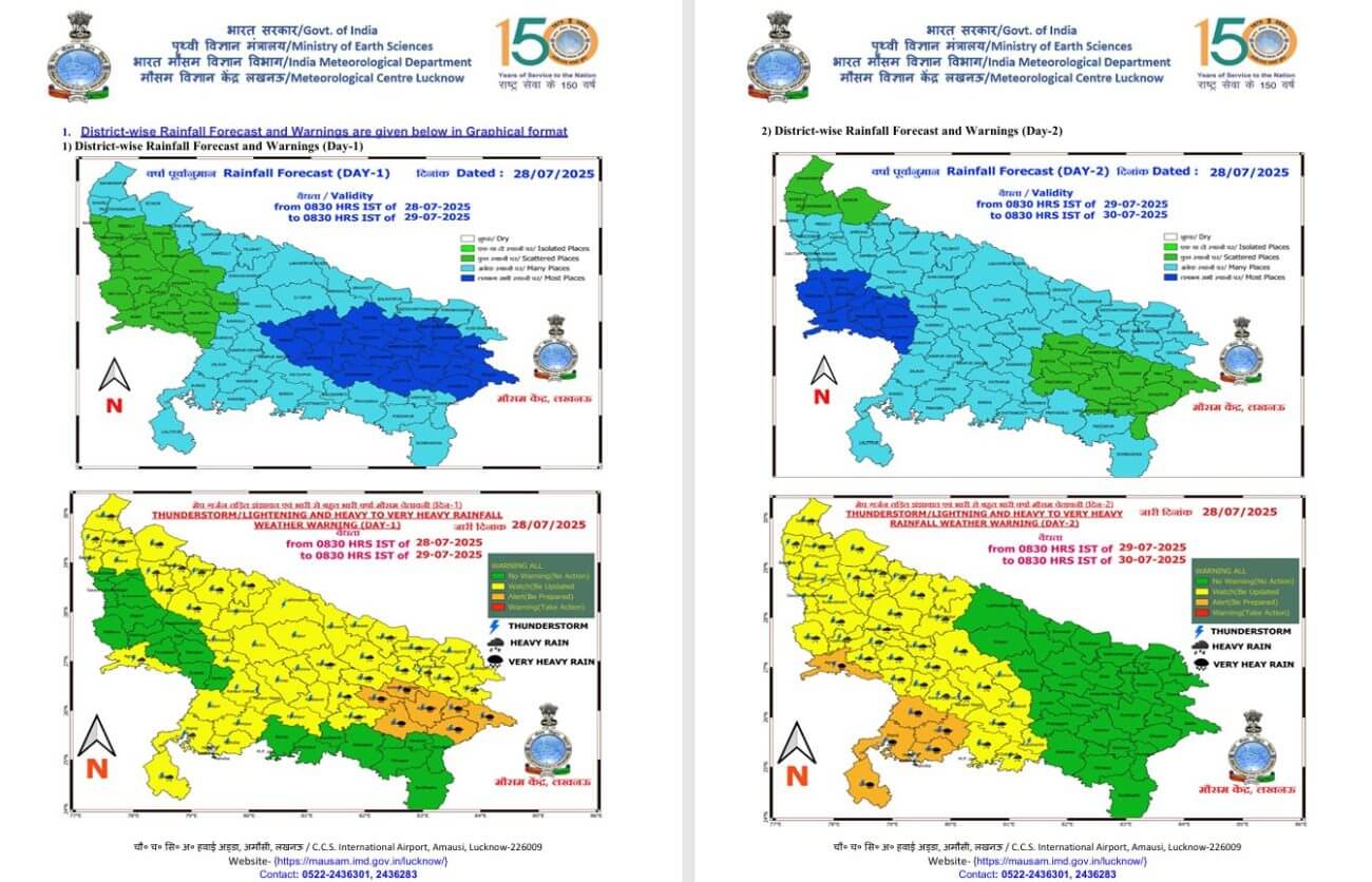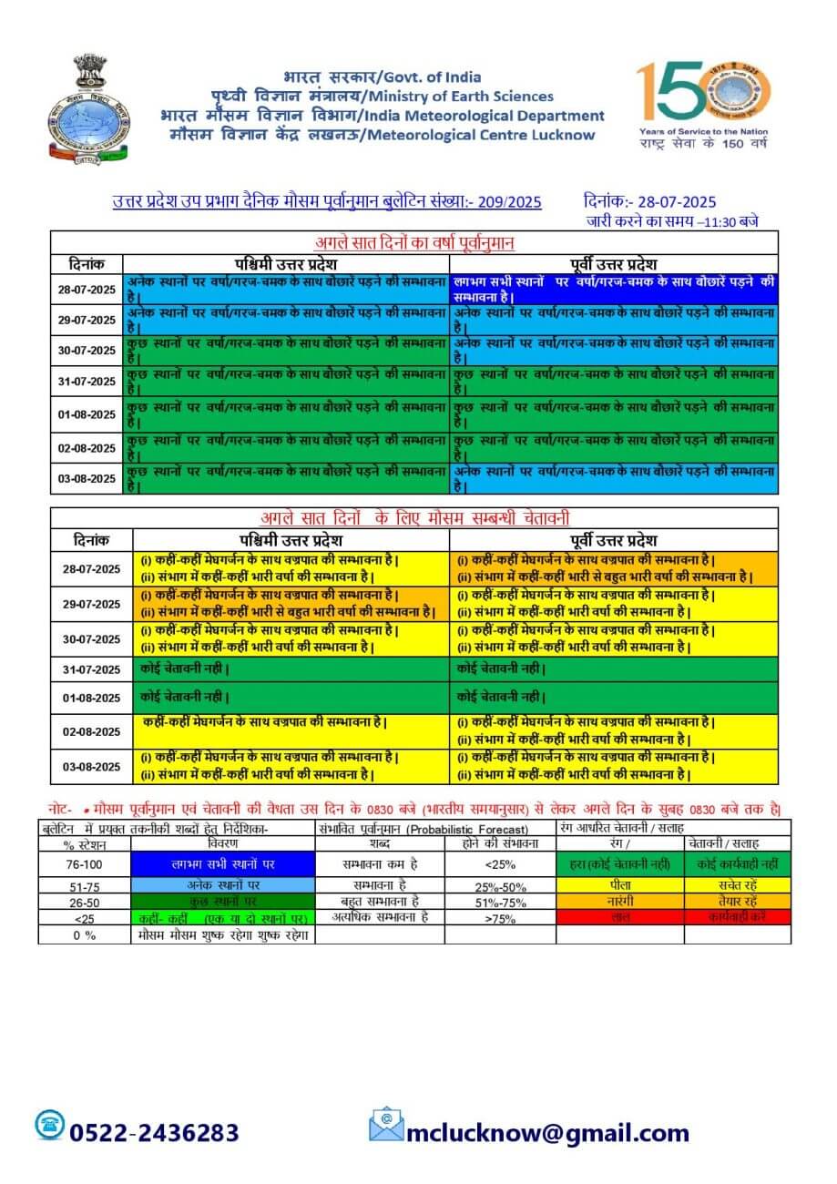 - 1-08-2025: पश्चिमी/ पूर्वी यूपी में कुछ स्थानों पर वर्षा/गरज-चमक के साथ बौछारें ।कहीं कहीं मेघगर्जन और वज्रपात के आसार।