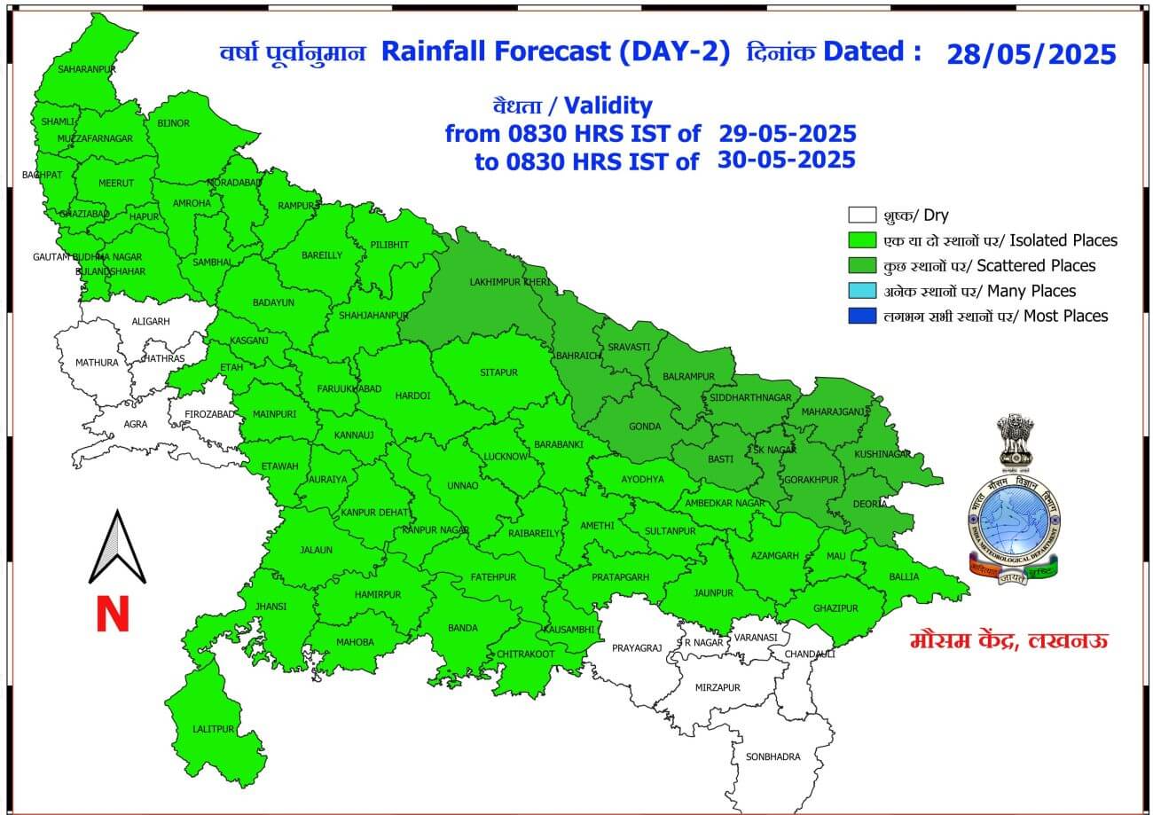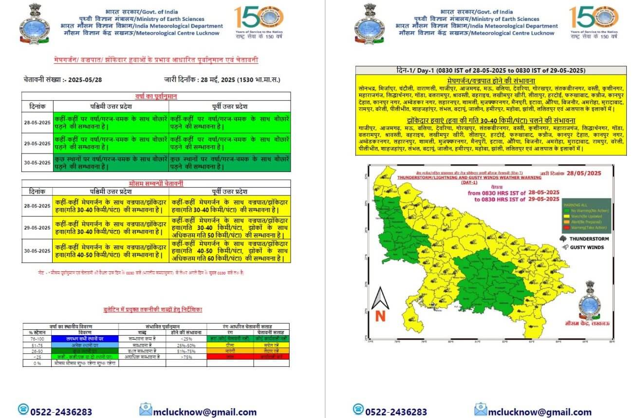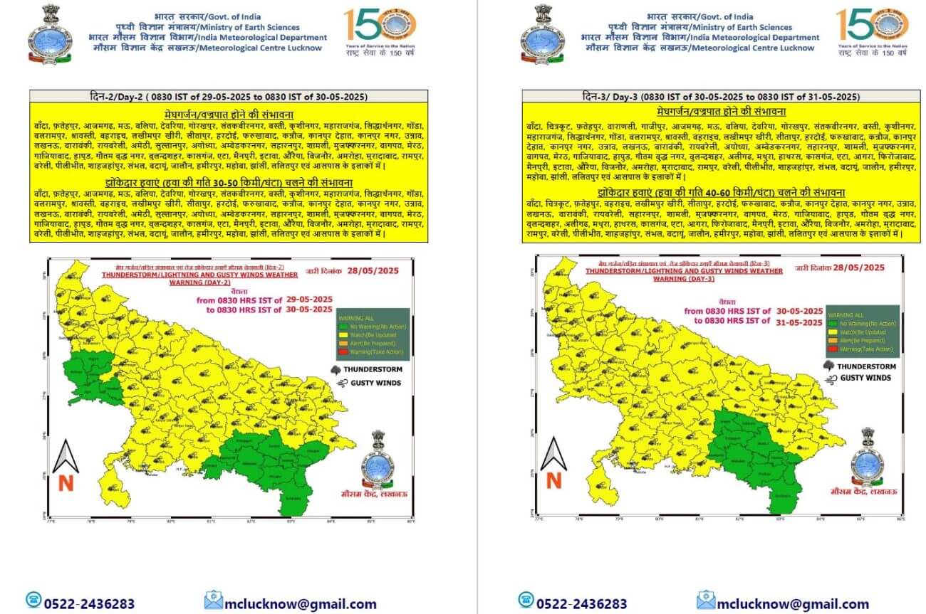 29 से 31 मई तक पूर्वी और पश्चिमी भाग में गरज चमक के साथ तेज हवाएं और बारिश की संभावना जताई गई है। कहीं-कहीं पर बादल गरजने व बिजली चमकने के साथ ही 30 से 40 किलोमीटर प्रति घंटा की रफ्तार से झोंकेदार हवा चल सकती हैं। 1 जून को पश्चिमी यूपी में मौसम साफ रह सकता है, जबकि पूर्वी यूपी में कहीं-कहीं पर बारिश हो सकती है। मौसम विभाग ने उत्तर प्रदेश में 18 जून तक मानसून के पहुंचने के संकेत दिए हैं।