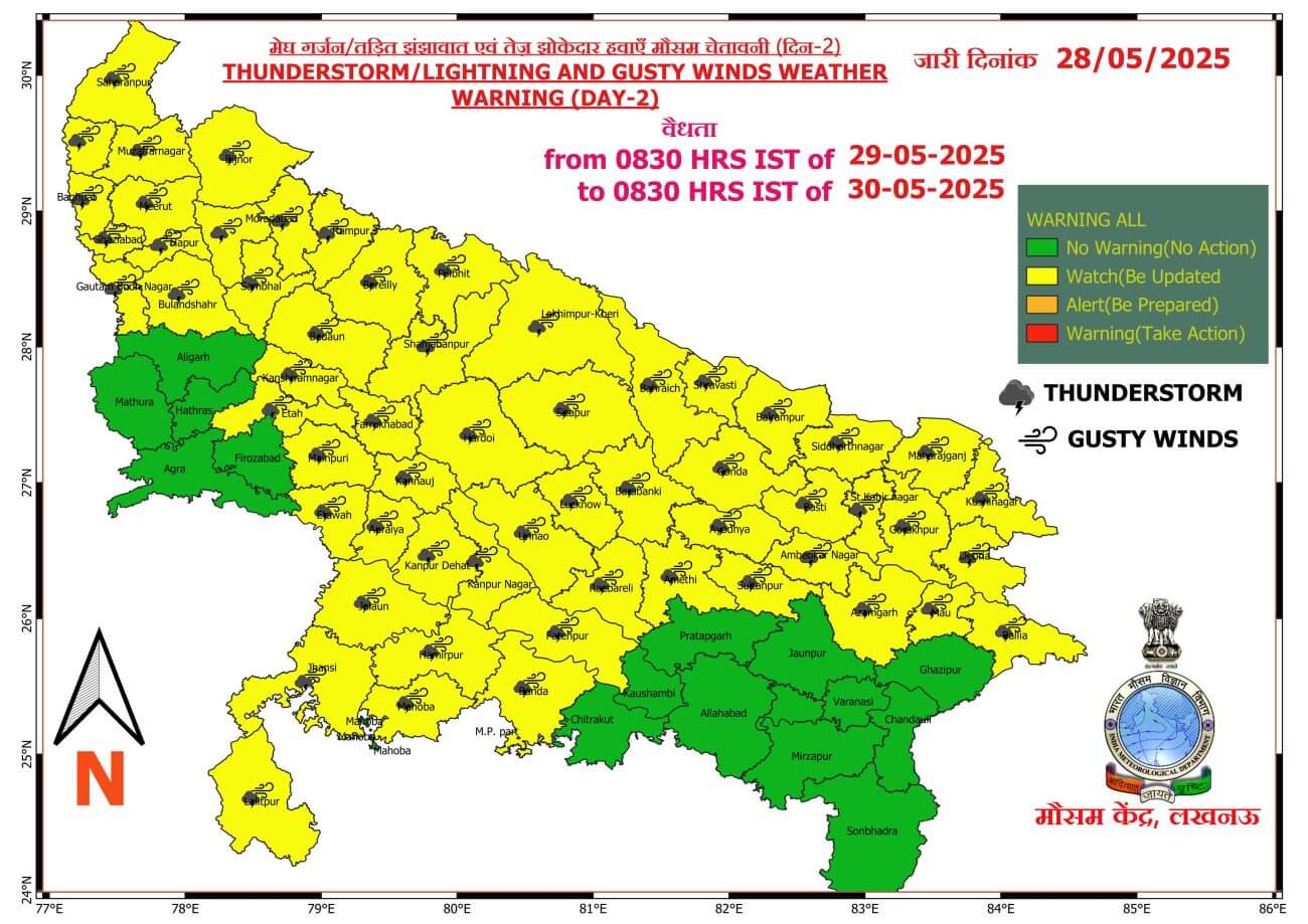उत्तर प्रदेश में मानसून की दस्तक भले ही जून में होगी लेकिन इसके पहले प्री मानसून गतिविधियों के चलते 2 जून तक बादल बारिश और आंधी की स्थिति बनी रहेगी। आज गुरूवार को पश्चिमी और पूर्वी यूपी में हल्की से मध्यम बारिश और बादल गरजने व बिजली चमकने के साथ ही 30 से 50 किलोमीटर प्रति घंटा की रफ्तार से झोंकेदार हवा चल सकती है।