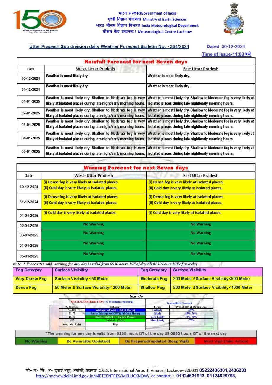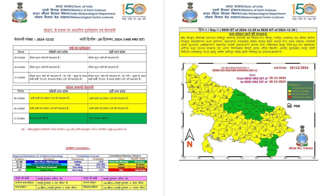 - सोमवार को बांदा, चित्रकूट, कौशांबी, प्रयागराज, फतेहपुर, मऊ, प्रतापगढ़, वाराणसी, संत रविदास नगर, जौनपुर, गाजीपुर, आजमगढ़ , बलिया ,देवरिया, गोरखपुर, संतकबीरनगर, बस्ती, कुशीनगर, महाराजगंज, फर्रुखाबाद, कन्नौज, कानपुर देहात, कानपुर नगर रायबरेली और अमेठी में घने कोहरे छाने की संभावना है।