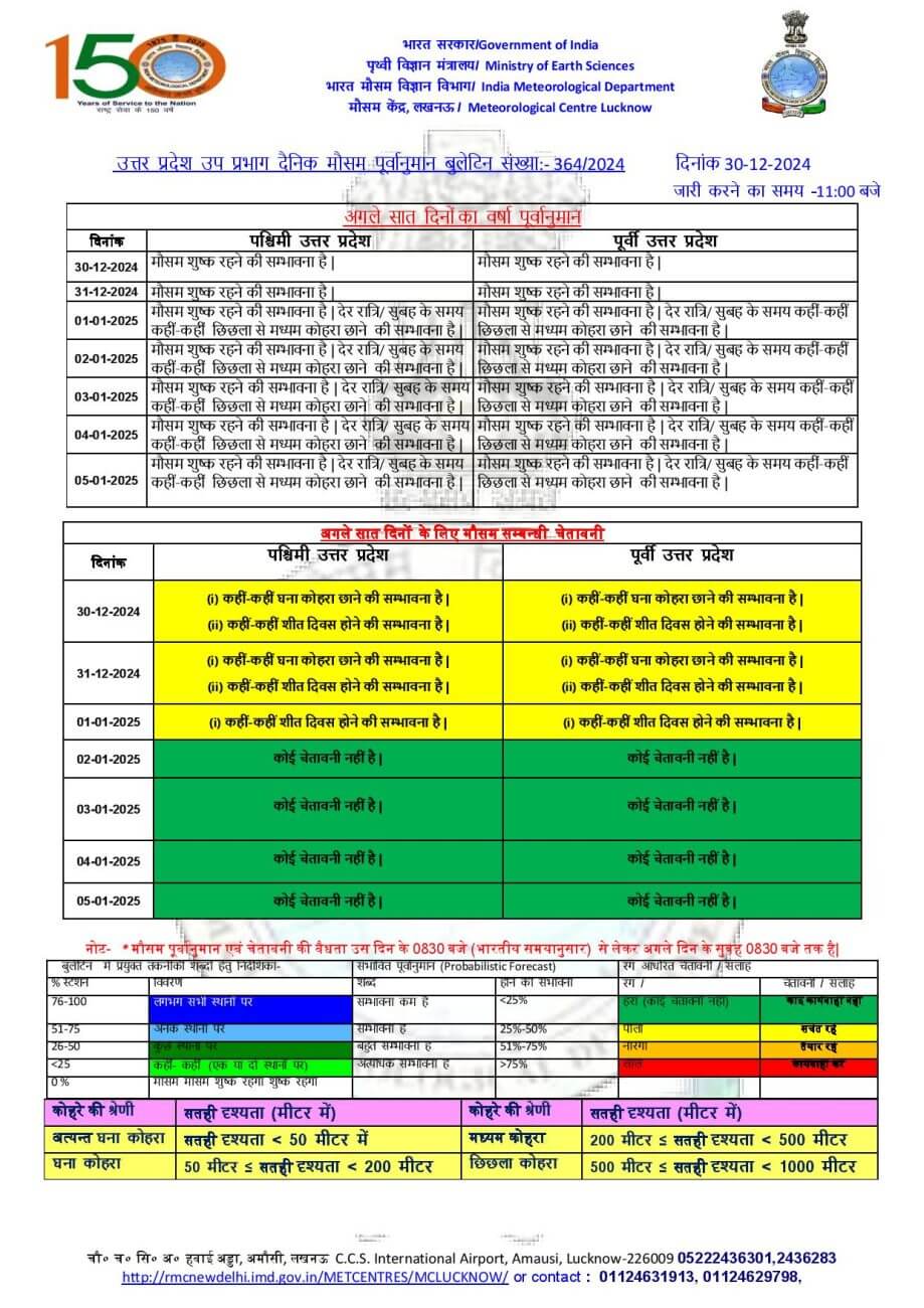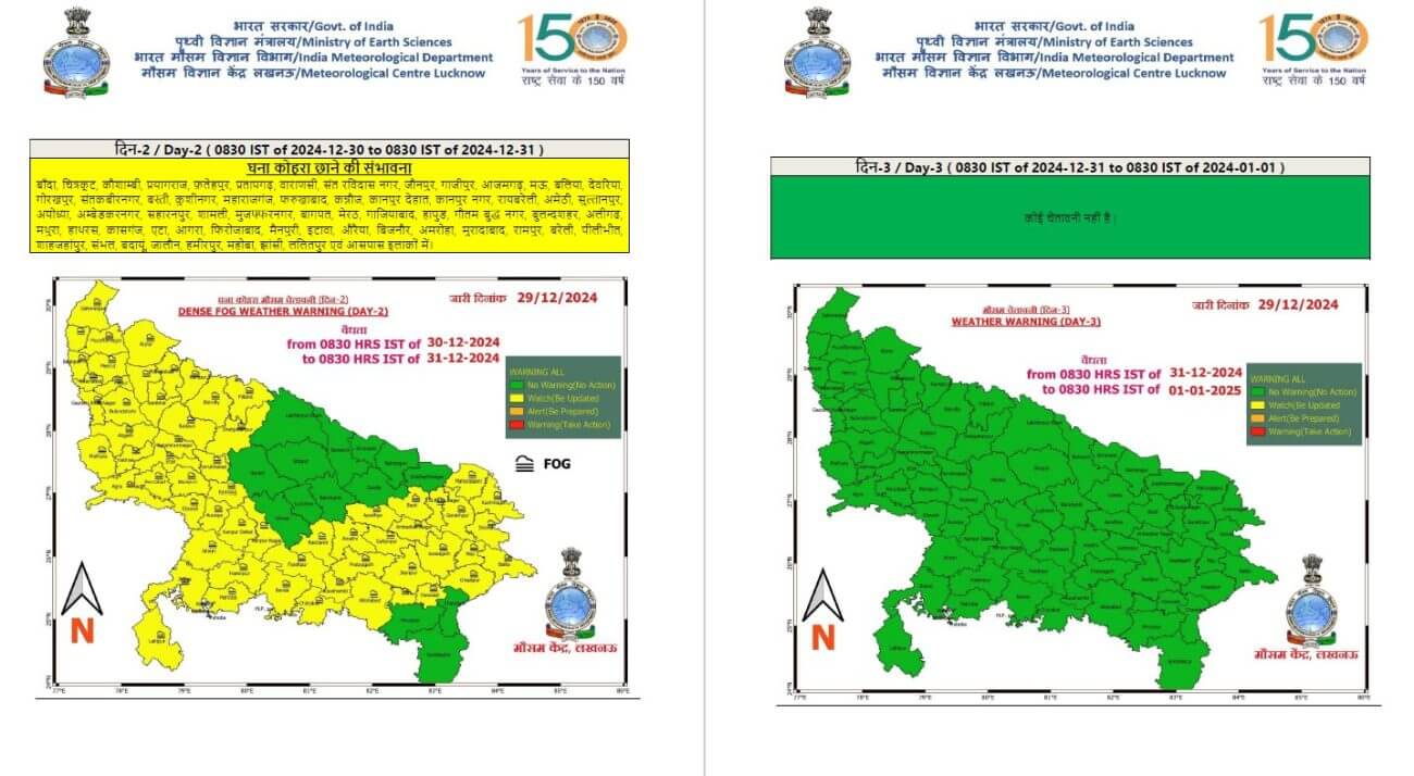 UP Weather Update Today: उत्तर प्रदेश में एक बार फिर ठंड ने रफ्तार पकड़ ली है।मौसम साफ और शुष्क हो गया है, लेकिन आज 30 दिसंबर को पूर्वी और पश्चिमी यूपी के करीब 60 जिलों में मध्यम से घना कोहरा छाने की संभावना जताई है। पहाड़ों से आ रही उत्तरी-पछुआ हवा से अगले 2-3 दिनों में न्यूनतम तापमान में 3-6 डिग्री सेल्सियस की गिरावट आने का अनुमान है, जिसके प्रभाव से ठंड का असर और तेज होगा।