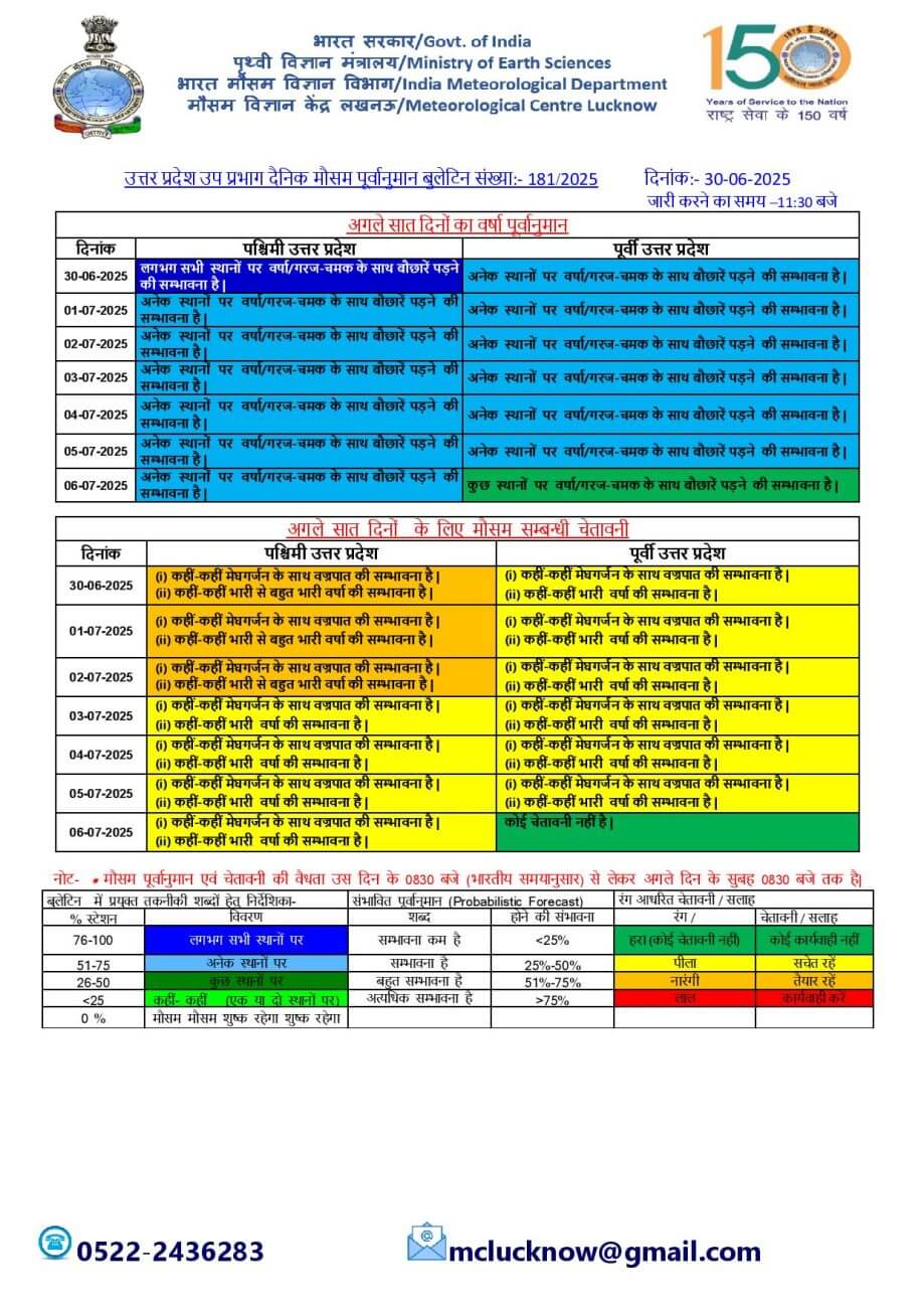 मानसून ,चक्रवाती परिसंचरण और पूर्वी-पश्चिमी द्रोणिका के असर से आगामी 24-48 घंटे में प्रदेश भर में भारी से अति भारी बारिश होने की आशंका जताई गई है। विशेष रूप से पूर्वी और मध्य यूपी में इसका अधिक प्रभाव देखा जा सकता है। 1 से 6 जुलाई के बीच पश्चिमी व पूर्वी यूपी में अनेक स्थानों पर वर्षा/गरज-चमक के साथ बौछारें पड़ने की सम्भावना है। कहीं-कहीं मेघगर्जन के साथ वज्रपात /भारी से बहुत भारी वर्षा का अलर्ट जारी किया गया है। मौसम विभाग ने किसानों, प्रशासन और आम नागरिकों को अलर्ट रहने की सलाह दी है।