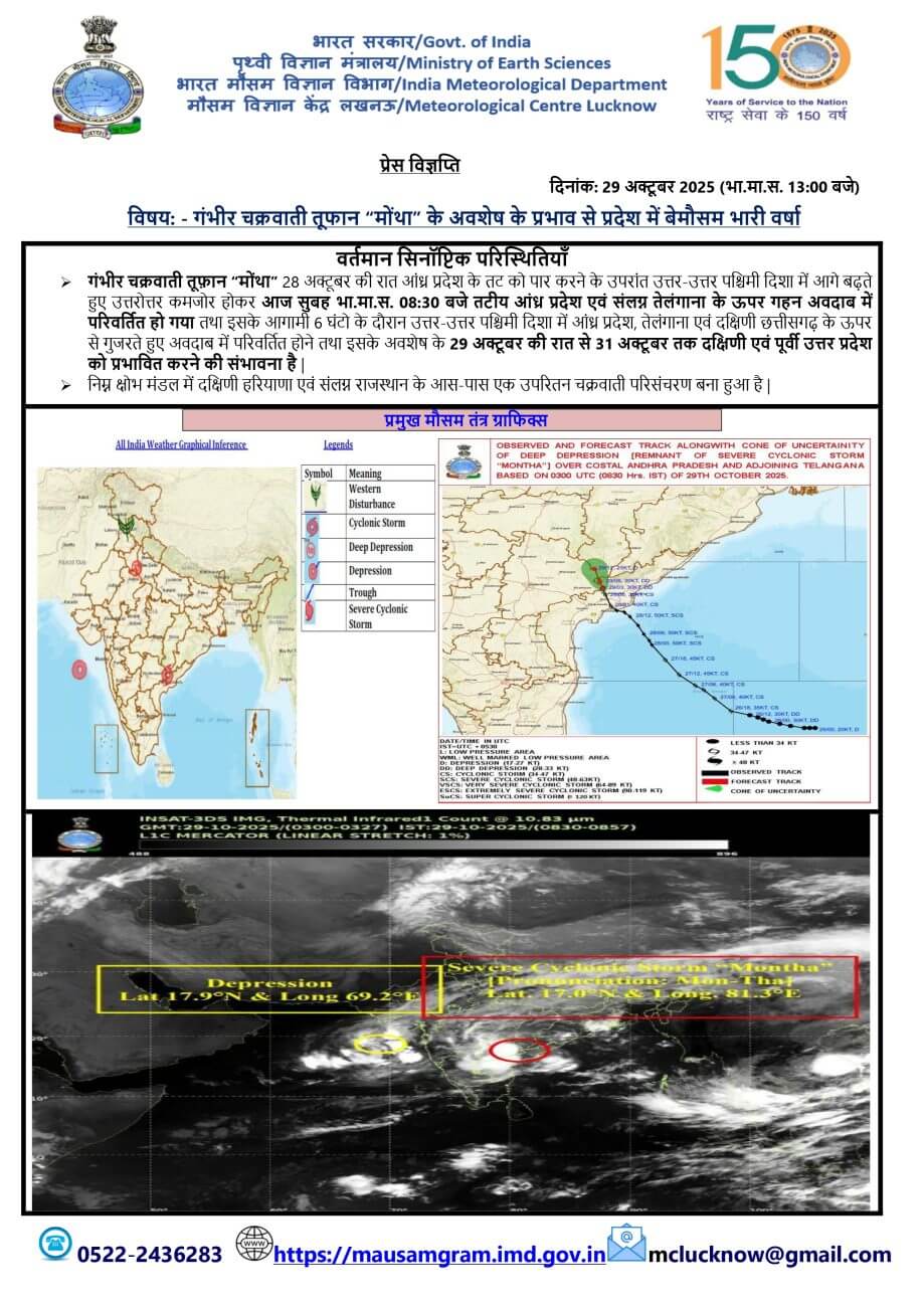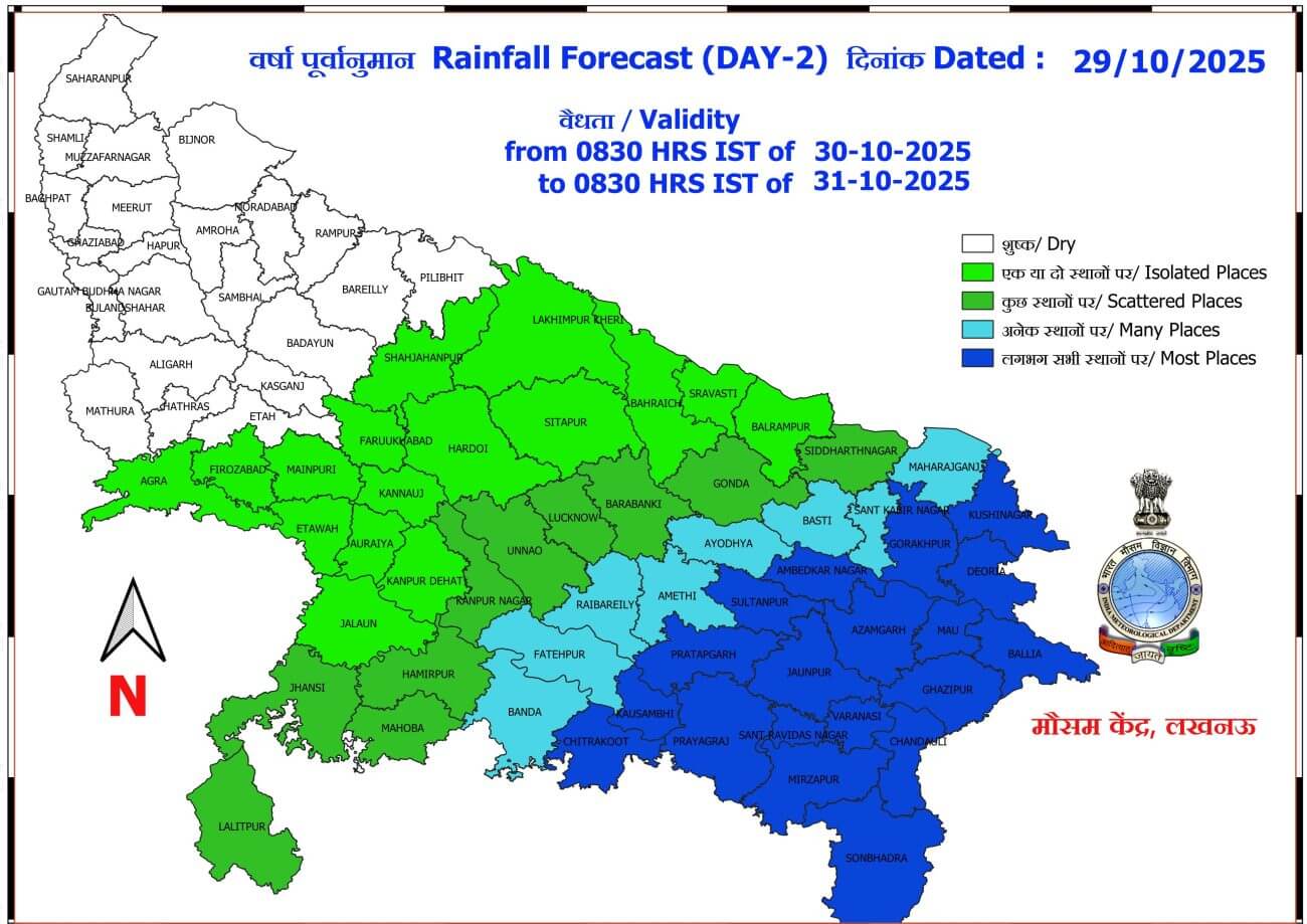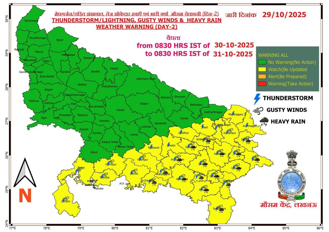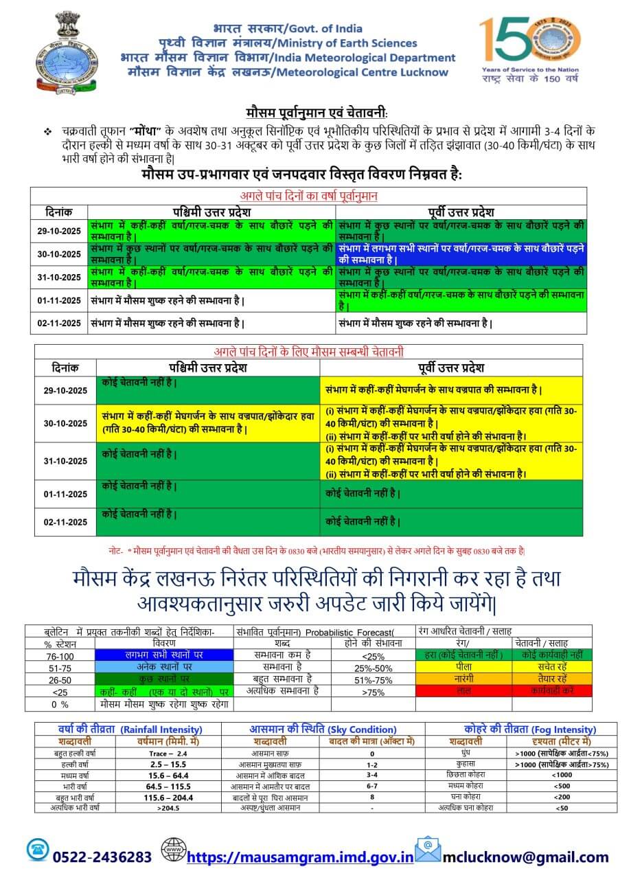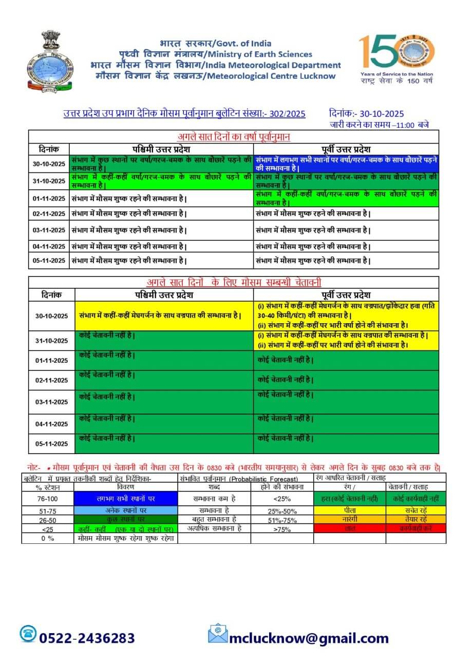 - 30-10-2025: पश्चिमी यूपी में कुछ / पूर्वी यूपी में लगभग सभी स्थानों पर बारिश/गरज चमक के साथ बौछारें। कहीं कहीं भारी बारिश, बादल गरजने व बिजली चमकने , 30 से 40 किमी प्रति घंटा की रफ्तार से झोंकेदार हवा
