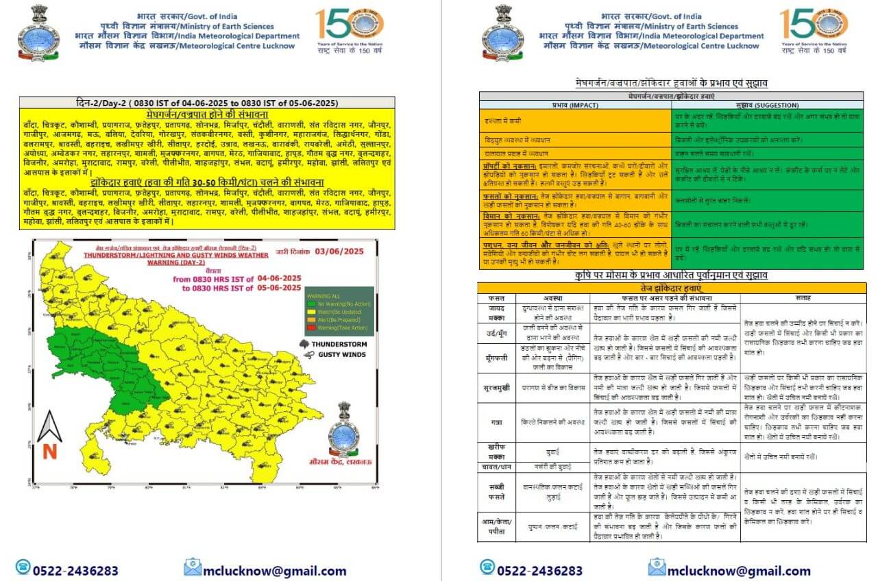 - बागपत, मेरठ, गाजियाबाद, हापुड़, गौतम बुद्ध नगर, बुलन्दशहर, बिजनौर, अमरोहा, मुरादाबाद, रामपुर, बरेली, पीलीभीत, शाहजहांपुर, संभल, बदायूं, हमीरपुर, गाजीपुर, श्रावस्ती, बहराइच, लखीमपुर खीरी, महोबा, झांसी, ललितपुर और उसके आसपास के इलाकों में 30 से 50 किलोमीटर प्रति घंटा की रफ्तार से झोंकेदार हवा चल सकती है।