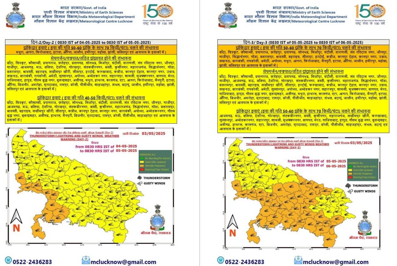 - लखनऊ, बाराबंकी, रायबरेली, अमेठी, सुल्तानपुर, अयोध्या, अम्बेडकर नगर, सहारनपुर, शामली, मुजफ्फरनगर, बागपत, मेरठ, गाजियाबाद, हापुड, गौतमबुद्ध नगर, बुलंदशहर, अलीगढ, मथुरा, हाथरस, कासगंज, एटा और आगरा में बादल गरजने व बिजली चमकने की संभावना है।