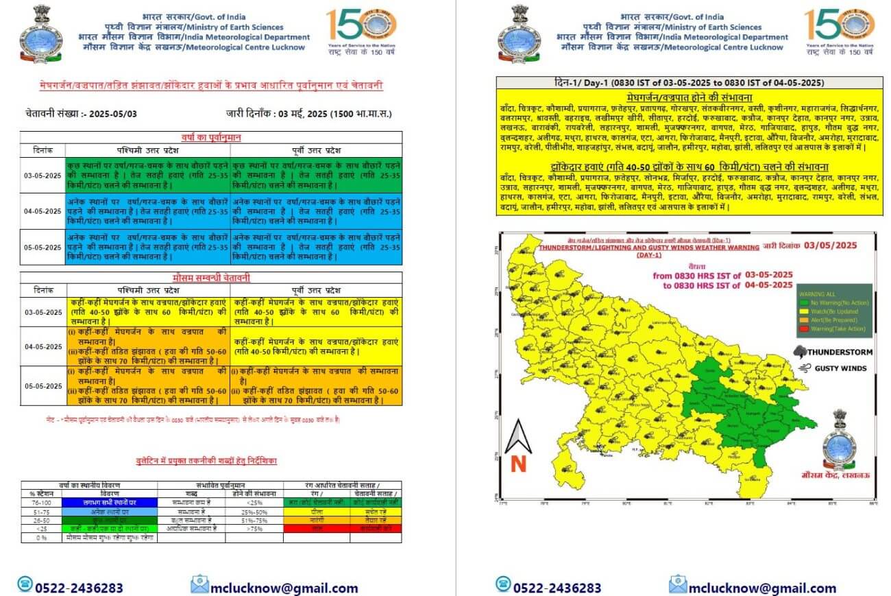 - 5 और 6 मई को प्रदेश के पश्चिमी और पूर्वी हिस्से में बारिश ,बादल-बिजली और झोंकेदार हवा का दौर जारी रहने का अनुमान है।