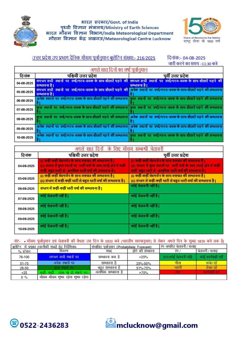 - 7-08-2025: पश्चिमी / पूर्वी यूपी में कुछ स्थानों पर वर्षा/गरज-चमक के साथ बौछारें ।