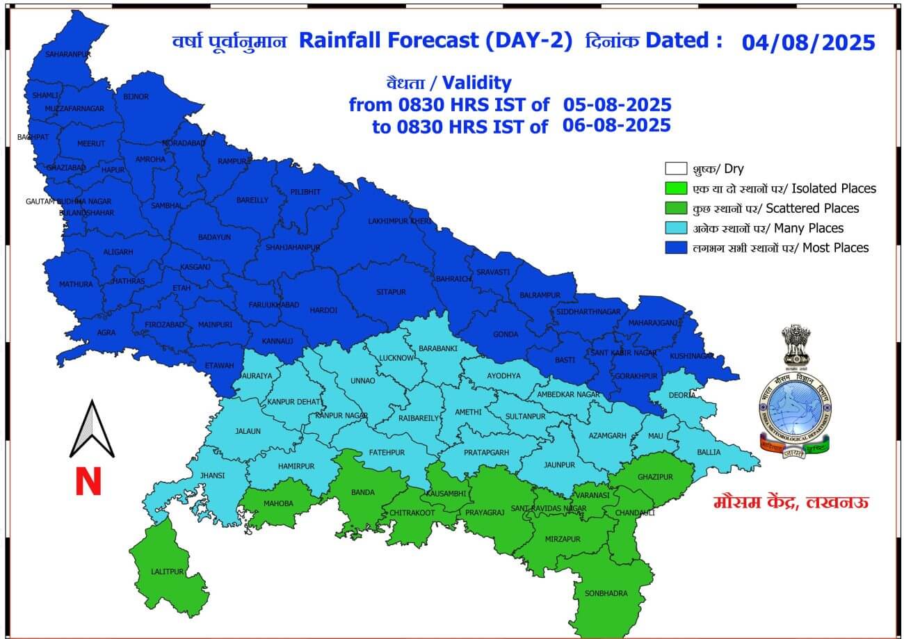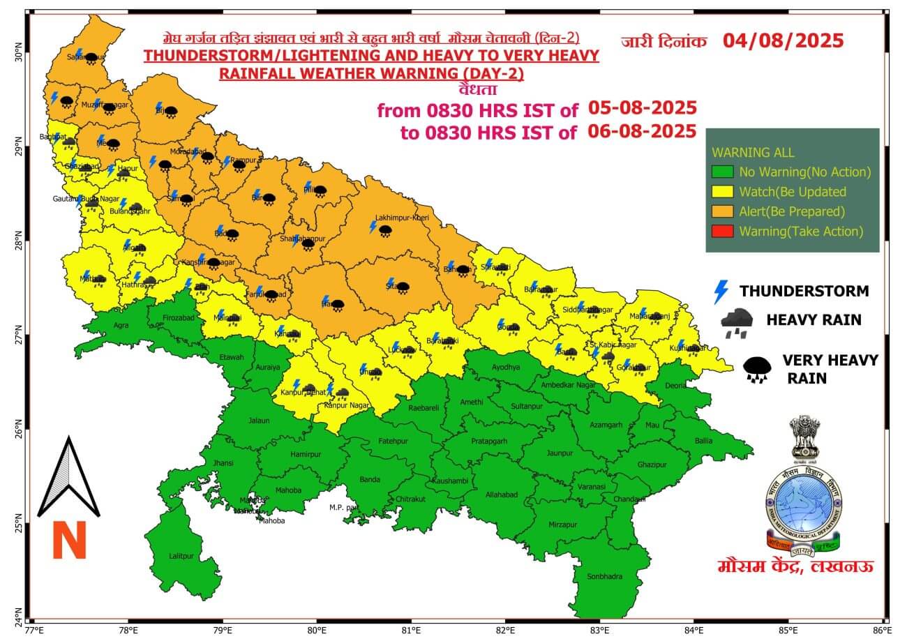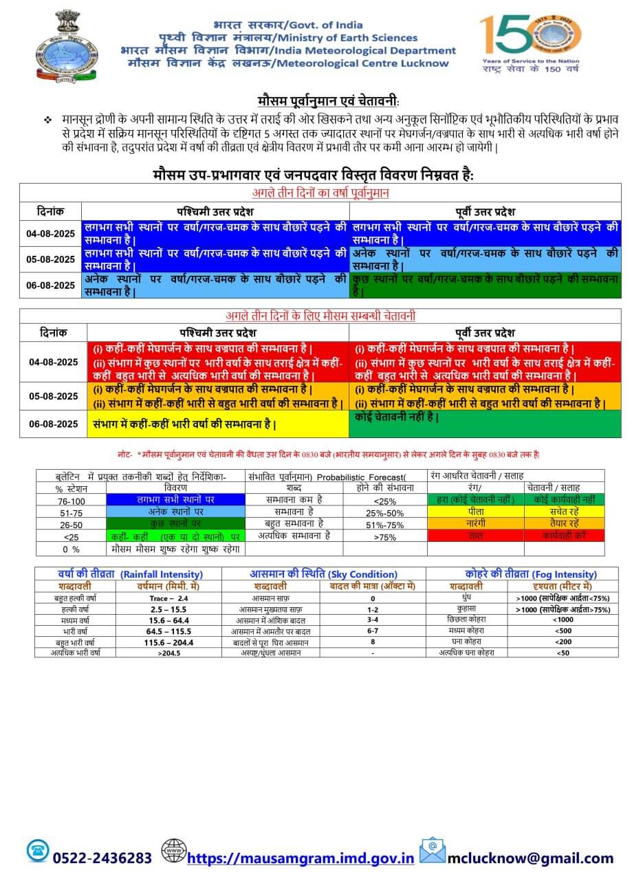 - 5-08-2025: पश्चिमी / पूर्वी यूपी में अनेक स्थानों पर वर्षा/गरज-चमक के साथ बौछारें ।कहीं कहीं भारी बारिश मेघगर्जन और वज्रपात के आसार।