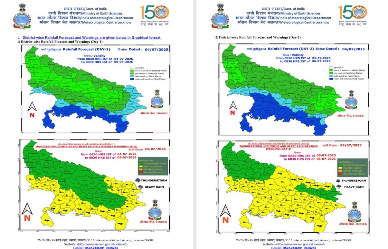 - 06-07-2025: पश्चिमी / पूर्वी यूपी में अनेक स्थानों पर वर्षा/गरज-चमक के साथ बौछारें ।कहीं-कहीं मेघगर्जन के साथ वज्रपात /भारी वर्षा।