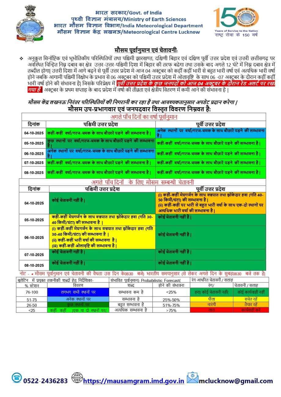 - 5-10-2025: पश्चिमी में कुछ / पूर्वी यूपी में कहीं स्थानों पर वर्षा/गरज-चमक के साथ बौछारें ।कहीं कहीं मेघगर्जन झोंकेदार हवा, बिजली