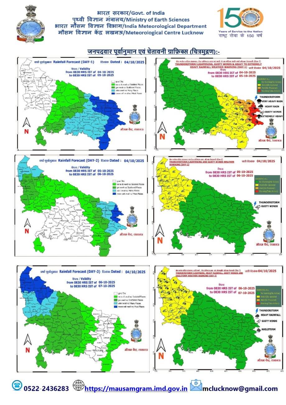 - 6-10-2025: पश्चिमी में अनेक / पूर्वी यूपी में कहीं कहीं स्थानों पर वर्षा/गरज-चमक के साथ बौछारें ।कहीं कहीं मेघगर्जन झोंकेदार हवा, बिजली, भारी वर्षा, ओलावृष्टि