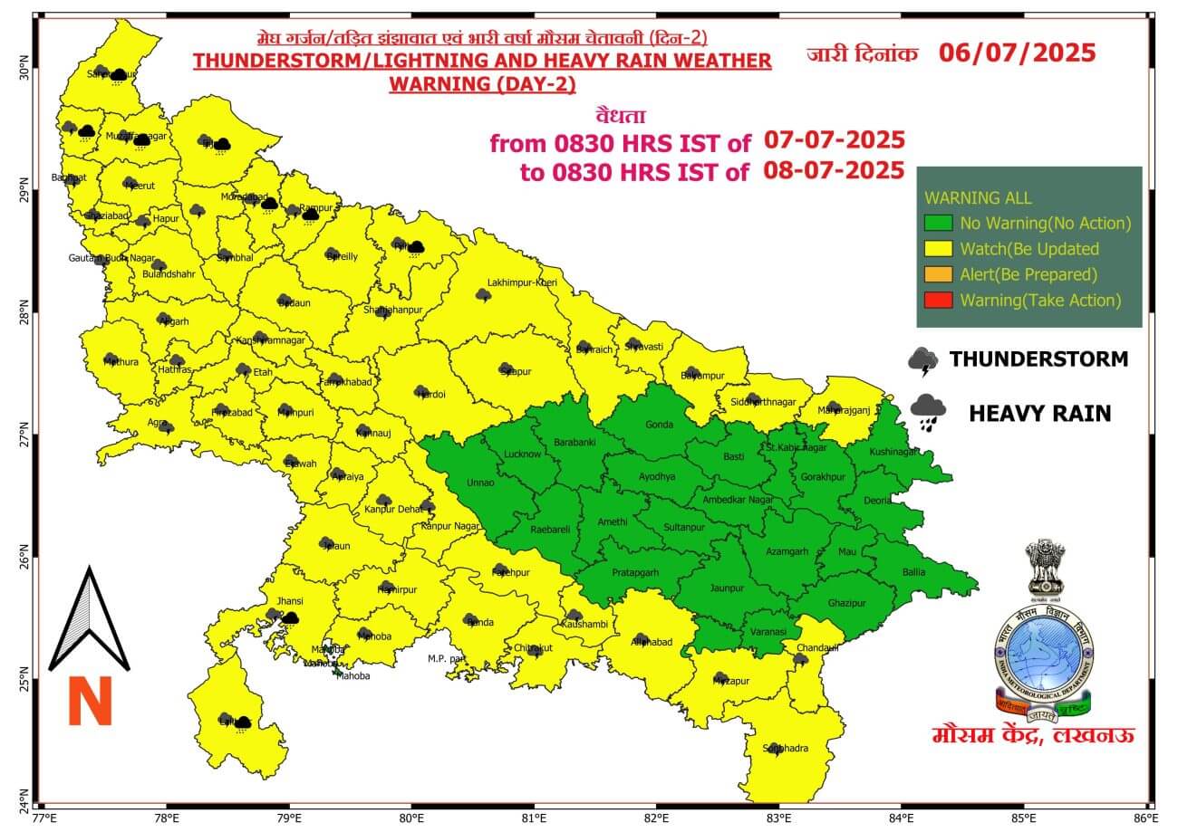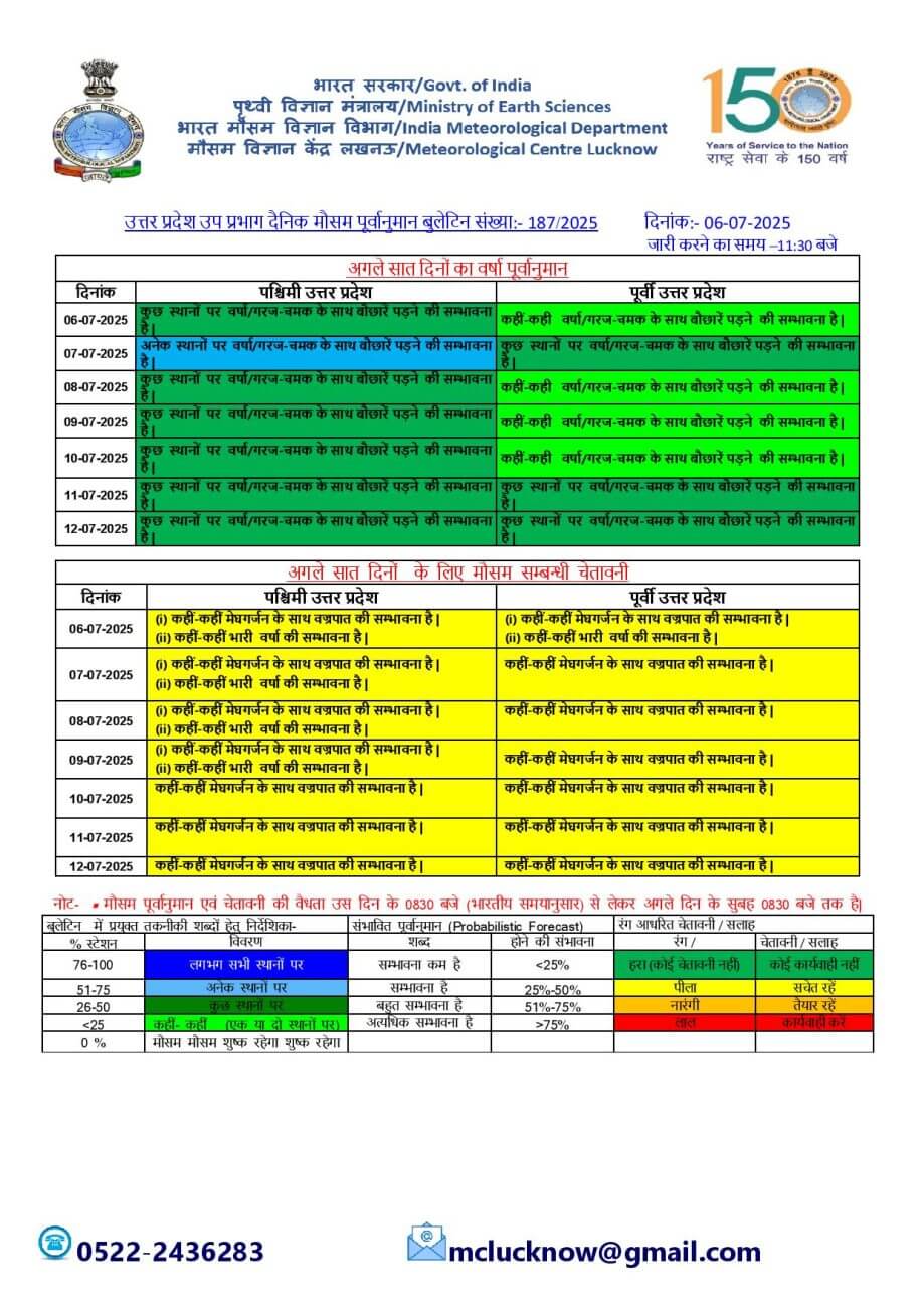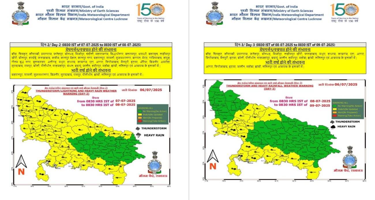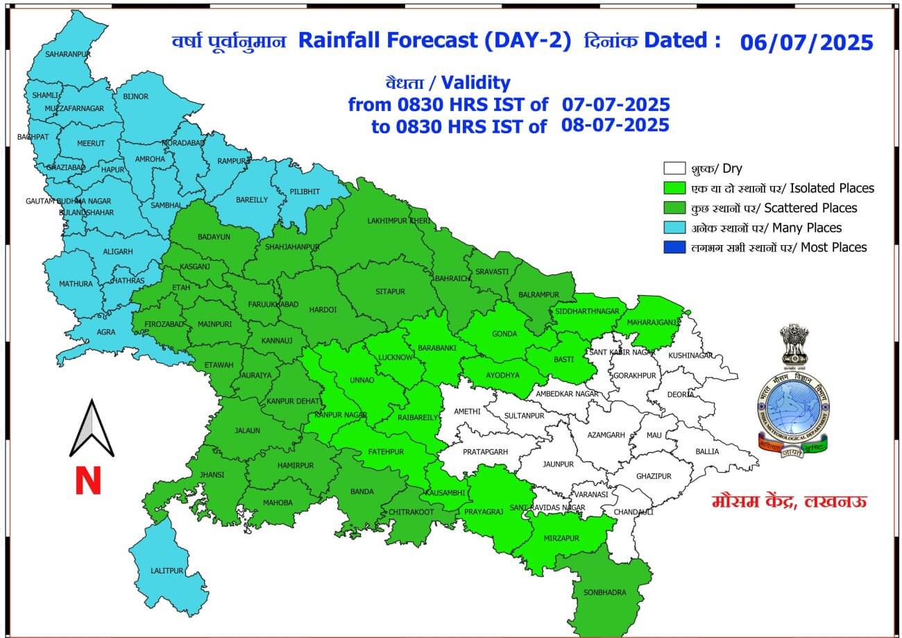 - 07-07-2025: पश्चिमी / पूर्वी यूपी में अनेक स्थानों पर वर्षा/गरज-चमक के साथ बौछारें ।कहीं-कहीं मेघगर्जन के साथ वज्रपात /भारी वर्षा।