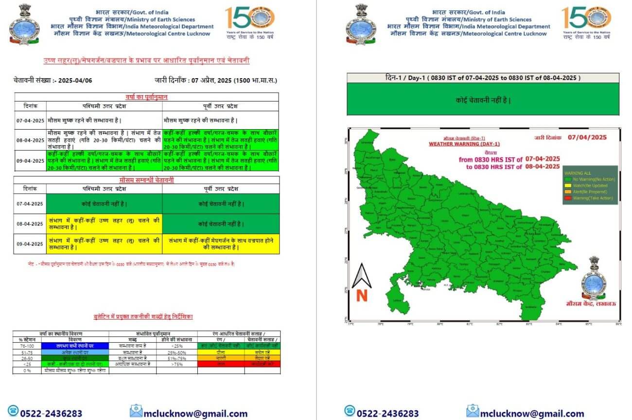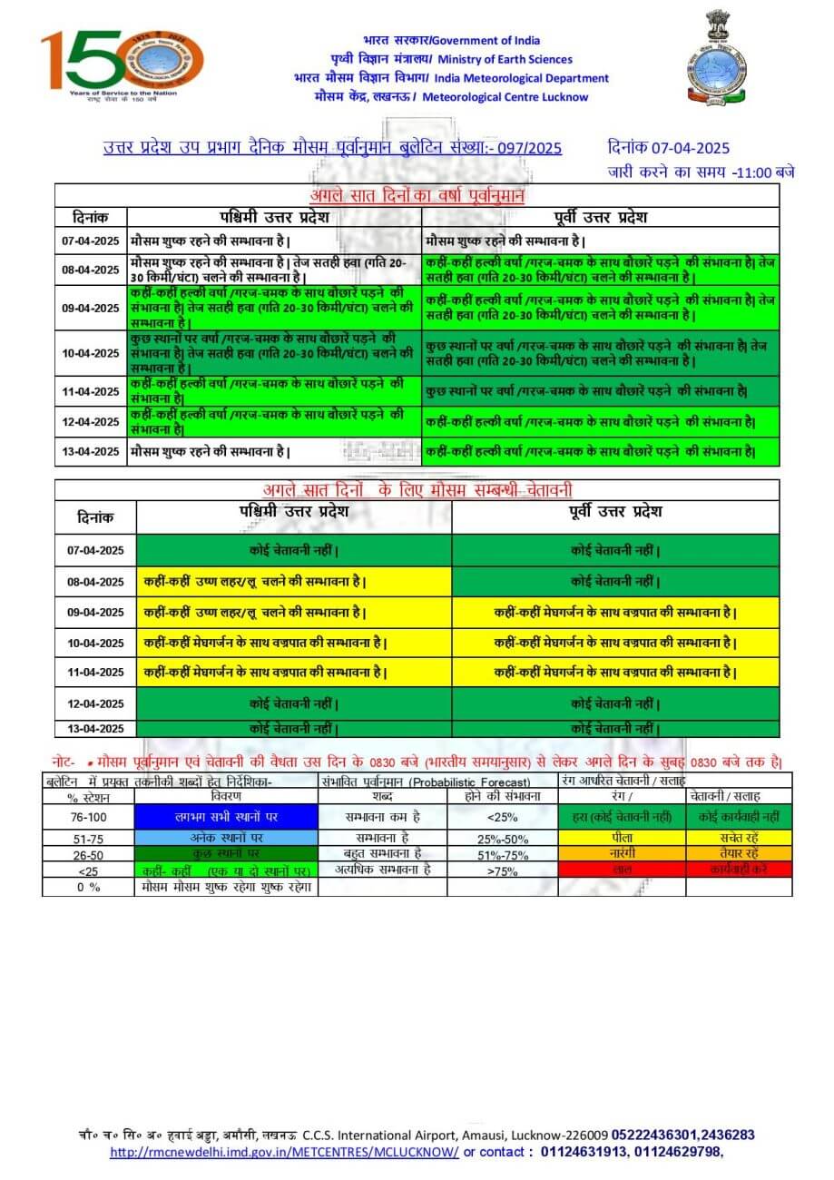 - 10 अप्रैल को प्रदेश के दोनों हिस्सों में कुछ स्थानों पर बारिश और गरज चमक के साथ बौछारें के आसार है।9- 10 अप्रैल के बीच देवरिया, गोरखपुर, संतकबीरनगर, बस्ती, कुशीनगर, महाराजगंज, सिद्धार्थनगर और आसपास के कुछ जिलों में गरज-चमक के साथ बारिश और वज्रपात की संभावना जताई गई है।