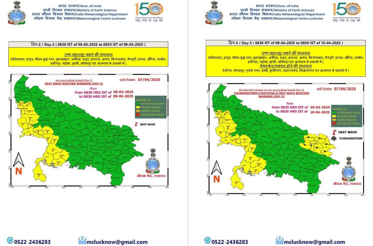 - गाजियाबाद, हापुड़, गौतमबुद्ध नगर, बुलंदशहर, अलीगढ़, मथुरा, आगरा, फिरोजाबाद, हाथरस, इटावा, औरैया, जालौन, हमीरपुर, महोबा, झांसी, ललितपुर और मैनपुरी जिले में लू चलने का अलर्ट जारी किया गया है।
