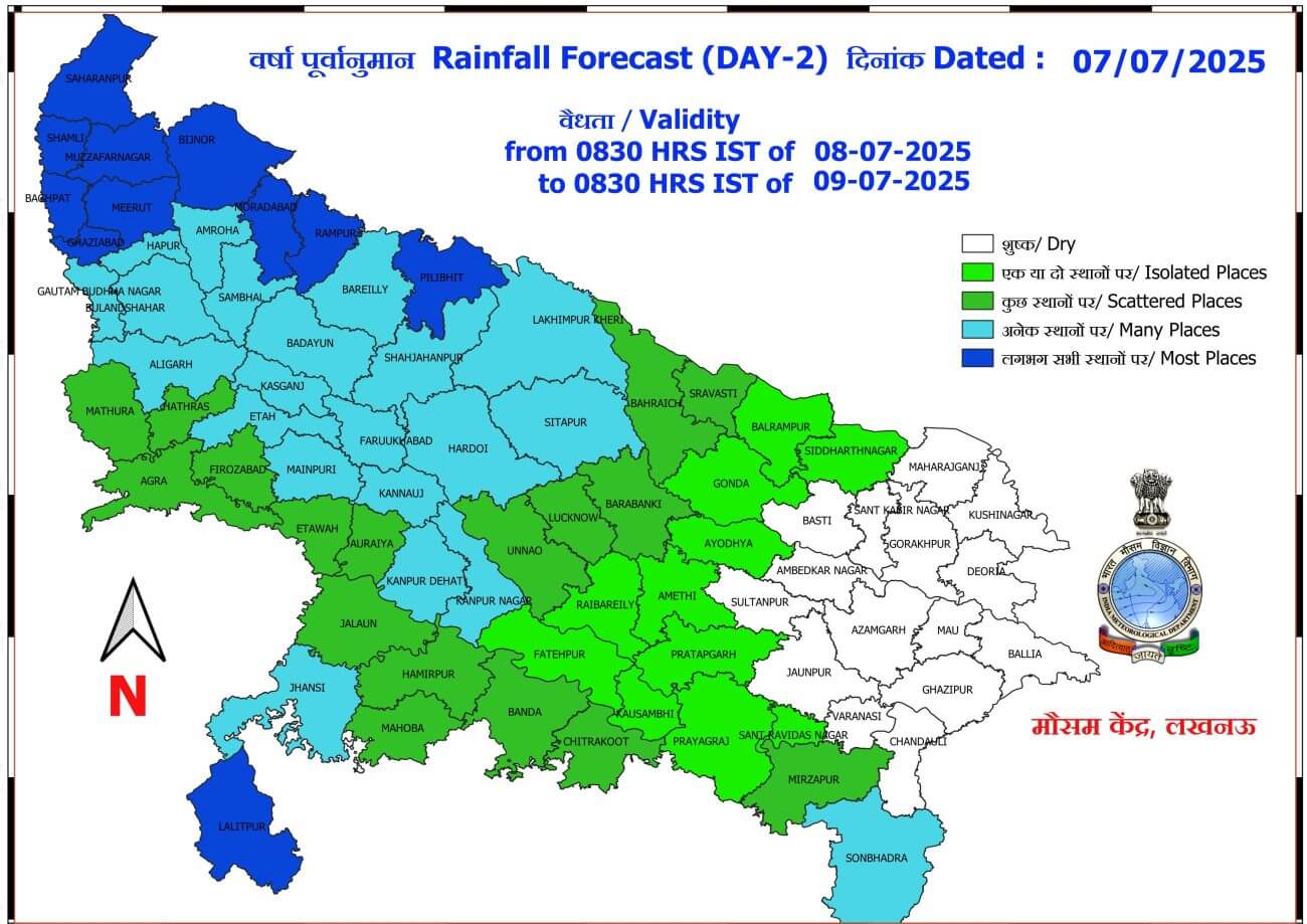 - 09-07-2025: पश्चिमी / पूर्वी यूपी में अनेक स्थानों पर वर्षा/गरज-चमक के साथ बौछारें ।कहीं-कहीं मेघगर्जन के साथ वज्रपात /भारी वर्षा।