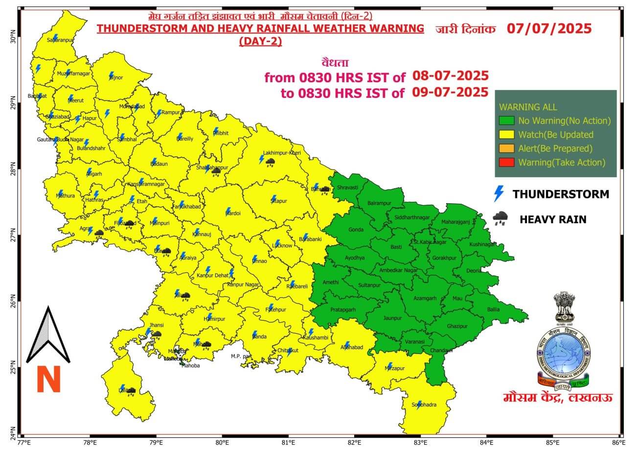 - 10-07-2025:पश्चिमी कुछ स्थानों पर वर्षा/गरज-चमक के साथ बौछारें। पूर्वी यूपी में अनेक स्थानों पर वर्षा/गरज-चमक के साथ बौछारें ।कहीं-कहीं मेघगर्जन के साथ वज्रपात