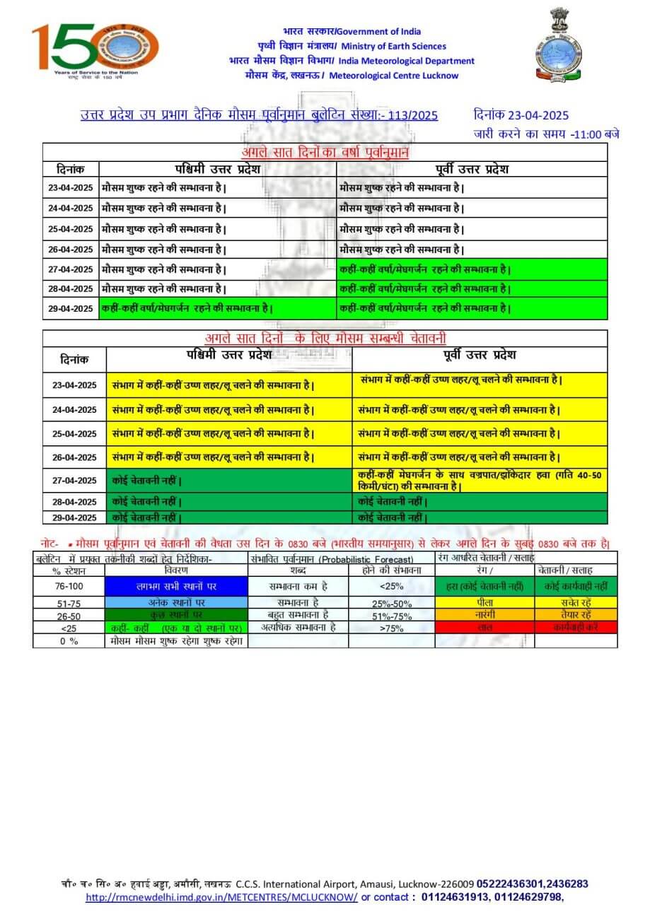 - प्रतापगढ़, चंदौली, वाराणसी, संत रविदास नगर, जौनपुर, गाजीपुर, आजमगढ़, मऊ, बलिया, रायबरेली, अमेठी, सुल्तानपुर, अम्बेडकरनगर एवं आसपास के इलाकों में लू का ऑरेंज अलर्ट।
