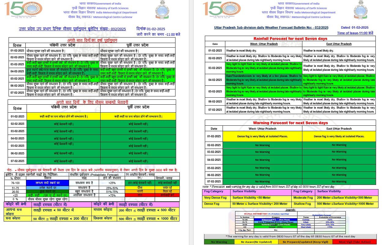 - आज एक फरवरी शनिवार को देवरिया, गोरखपुर, संतकबीरनगर, बस्ती, कुशीनगर, महाराजगंज, सिद्धार्थनगर, गोंडा , बलरामपुर, श्रावस्ती, बहराइच, लखीमपुर खीरी, सीतापुर, अयोध्या, अम्बेडकरनगर, सहारनपुर , शामली ,बरेली, मुजफ्फरनगर, बिजनौर, अमरोहा, बदायूं, मुरादाबाद, रामपुर, बरेली, पीलीभीत, शाहजहांपुर, संभल और उसके आसपास के इलाकों में मध्यम से घना कोहरा छाने की संभावना जताई गई है।