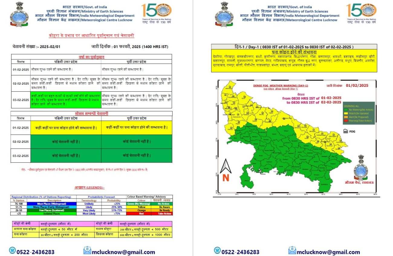 UP Weather Alert Today: उत्तर प्रदेश में फरवरी में शीतलहर और कोहरे का प्रकोप जारी है। आज 2 दर्जन से ज्यादा जिलों में कोहरे का अलर्ट जारी किया गया है। 2-3 फरवरी से एक नया पश्चिमी विक्षोभ सक्रिय होने जा रहा है, जिसके असर से दो दिन पश्चिमी यूपी में कहीं-कहीं हल्की बारिश की संभावना जताई गई है। इस अवधि में पूर्वी यूपी में मौसम साफ रहने का अनुमान है।