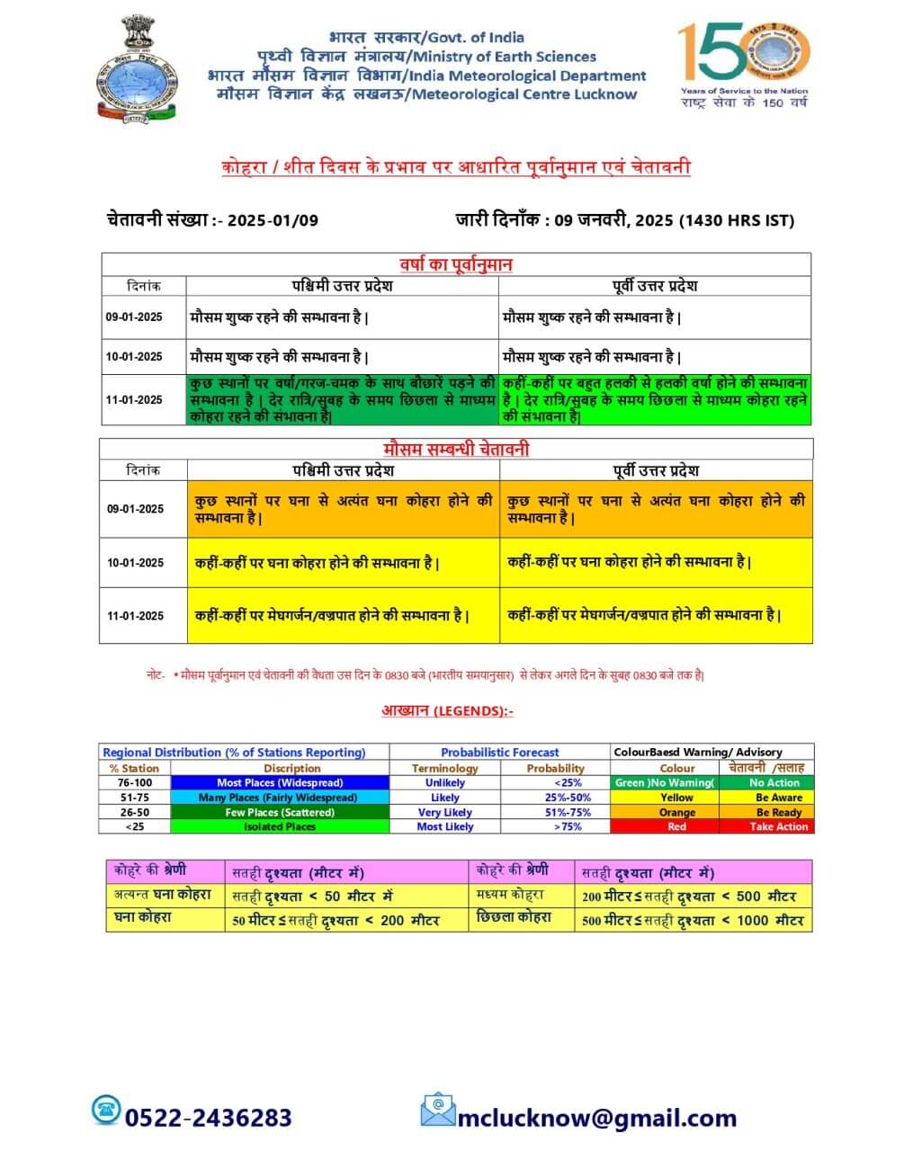 यूपी मौसम विभाग के मुताबिक, आज लखनऊ में सुबह शाम कोहरा छाया रहेगा। अधिकतम तापमान 20 व न्यूनतम तापमान 9 डिग्री सेल्सियस रहने की संभावना है।10 जनवरी को पश्चिमी विक्षोभ सक्रिय हो रहा है, जिसके प्रभाव से 11-12 जनवरी को पूर्वी और पश्चिमी यूपी में फिर बादल बारिश की स्थिति बनेगी। 13 जनवरी के बाद से फिर तापमान गिरेगा और सर्दी बढ़ने लगेगी।इस दौरान कोल्ड डे और शीतलहर की भी स्थिति बनेगी।