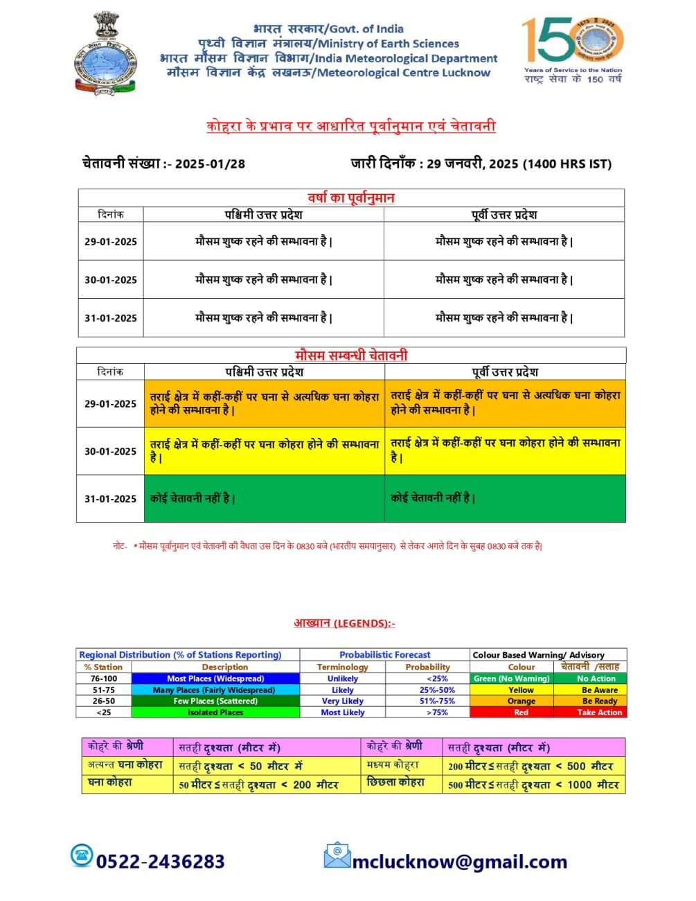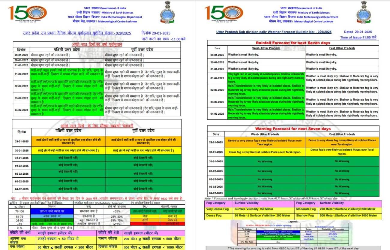 आज गुरूवार 30 जनवरी को पश्चिमी और पूर्वी यूपी के तराई क्षेत्र में कहीं-कहीं पर घना कोहरा छाने की संभावना है लेकिन 31 जनवरी को पश्चिमी यूपी में बूंदाबांदी के साथ छिछला से मध्यम कोहरा छाने के आसार है।