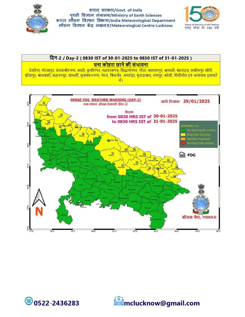 गुरुवार को देवरिया, गोरखपुर, संतकबीरनगर, बस्ती, कुशीनगर, महाराजगंज, सिद्धार्थनगर, गोंडा, बलरामपुर , श्रावस्ती ,बहराइच, लखीमपुर खीरी, सीतापुर, बाराबंकी, सहारनपुर, शामली, मुजफ्फरनगर, मेरठ, बिजनौर ,अमरोहा, मुरादाबाद, रामपुर, बरेली, पीलीभीत और उसके आसपास के इलाकों में घना कोहरा छाने की संभावना जताई गई है।