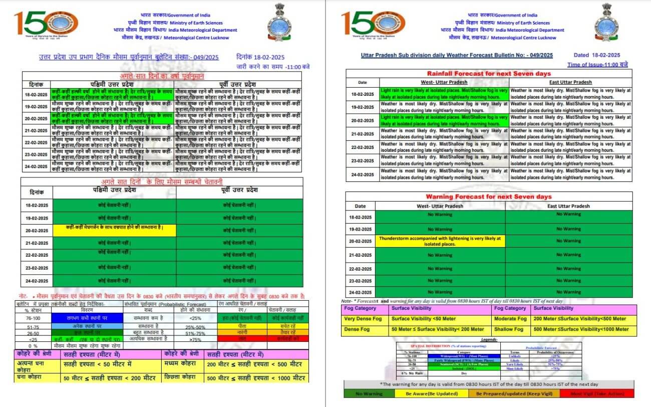 - 18 और 20 फरवरी को पश्चिमी विक्षोभ के असर से पश्चिमी यूपी में कहीं-कहीं पर हल्की बारिश की संभावना है, जबकि पूर्वी यूपी में मौसम साफ रहेगा। साथ ही दोनों हिस्सों में छिछला कोहरा छाने की भी संभावना है।