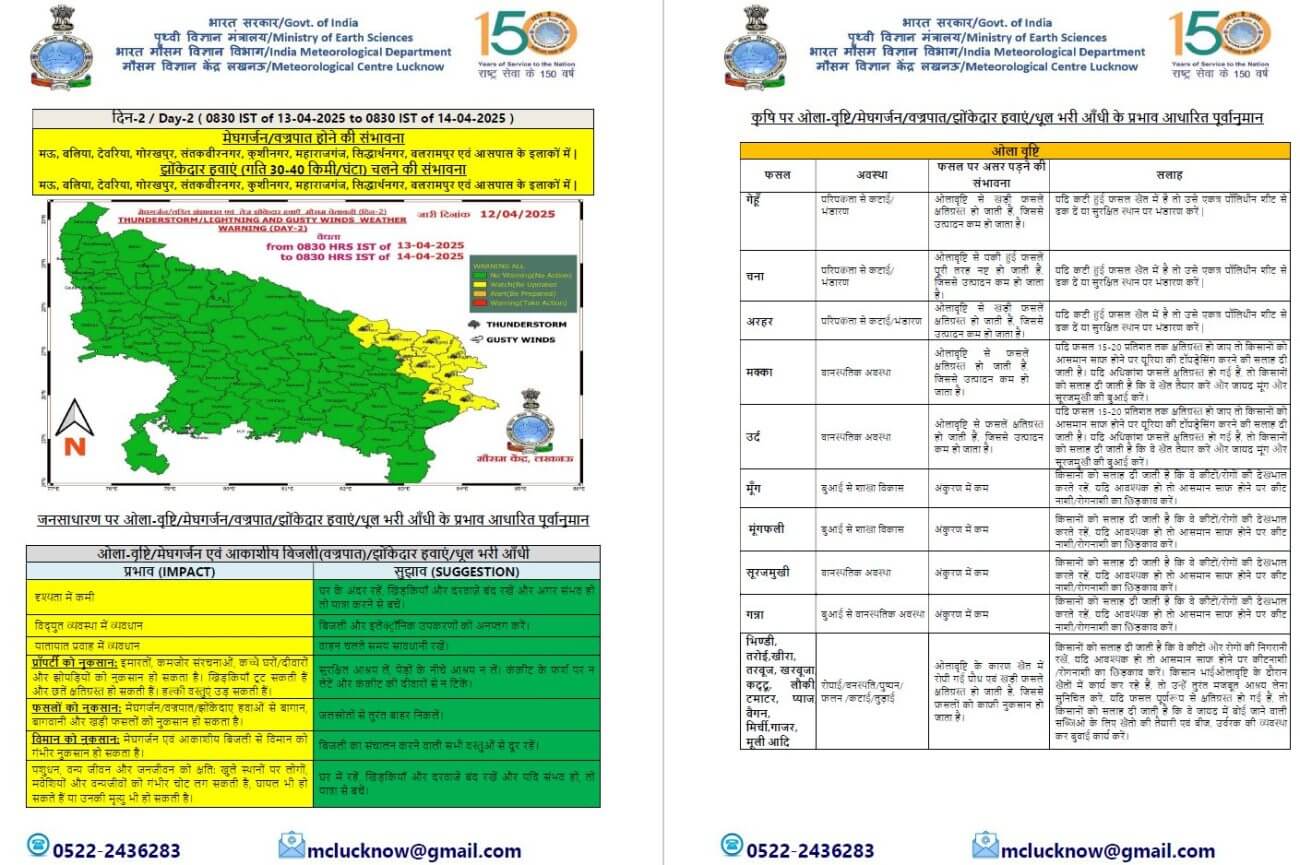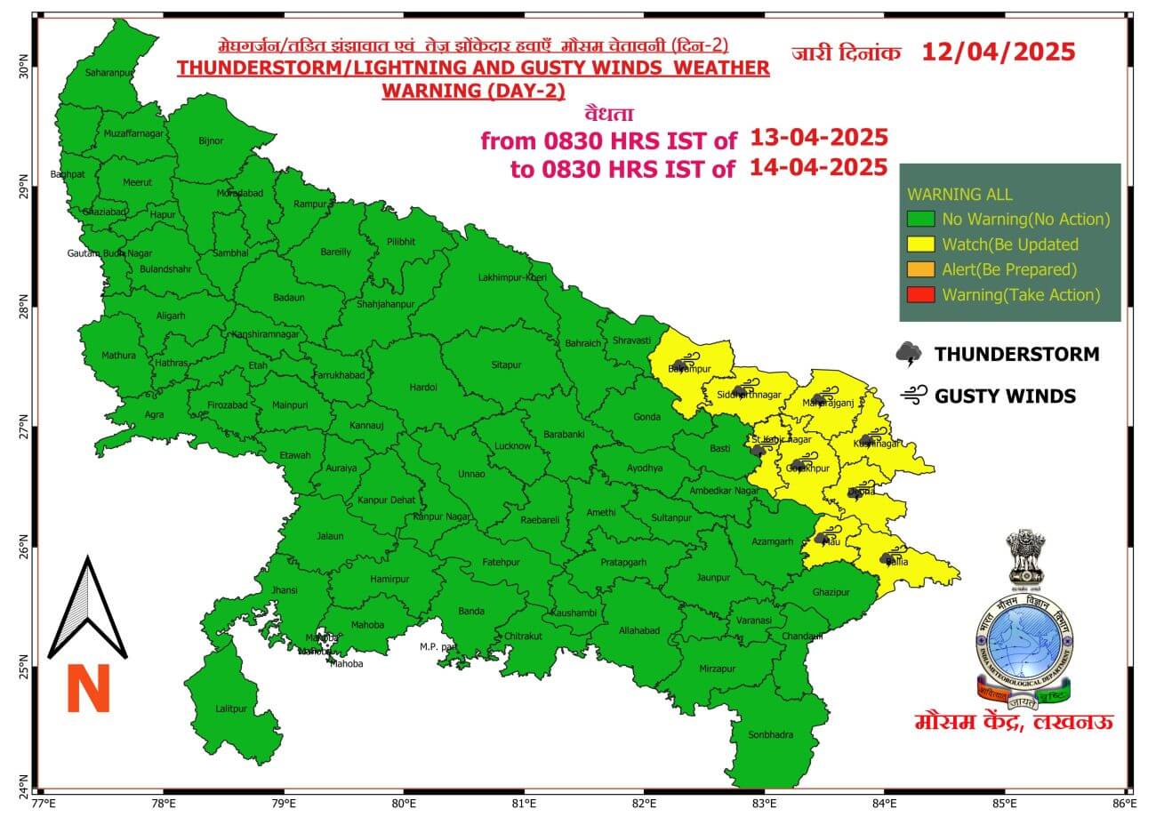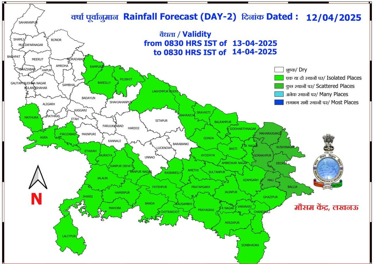 - 13 अप्रैल को प्रदेश में कहीं-कहीं पर बारिश और गरज चमक के साथ बौछारें पड़ सकती है। पूर्वी यूपी में कहीं-कहीं पर बादल गरजने व बिजली चमकने के साथ ही झोंकेदार हवा चलने की संभावना है।