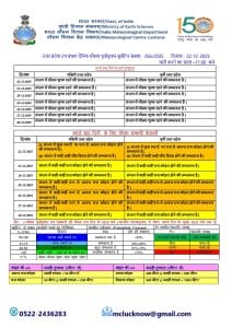 - 23-12-2025: पश्चिमी/पूर्वी हिस्से में मौसम शुष्क रहने की संभावना है।पश्चिमी व पूर्वी यूपी हिस्से में कहीं कहीं घना कोहरा छाने की संभावना है।